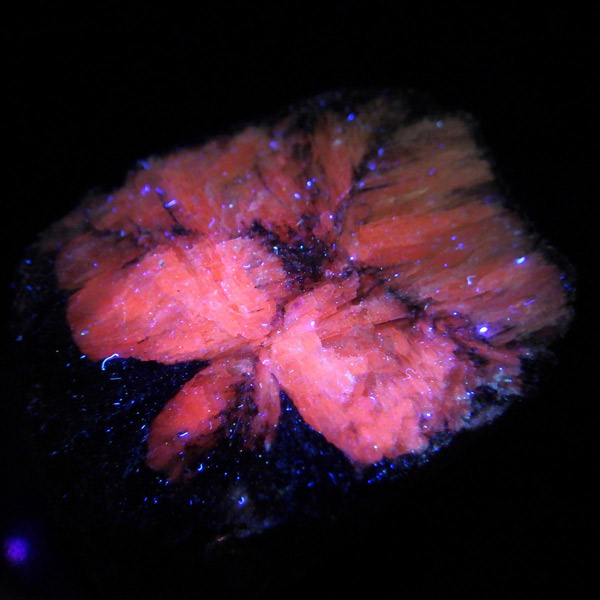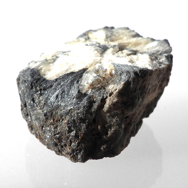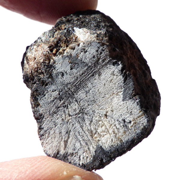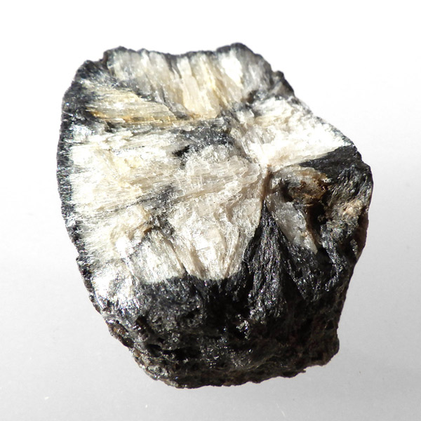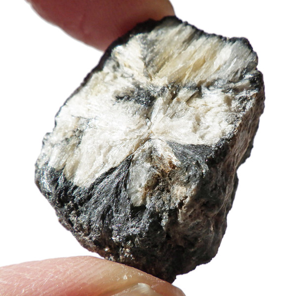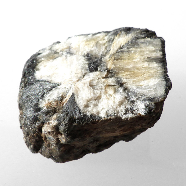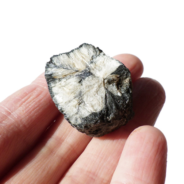ロシア産、キャストライト原石です。キャストライトは黒の十字模様が大変魅力的な石です。キャストライトの名前は、輪切りにすると黒い十字の模様が現れることから、ギリシャ語で「対角線的な配列」という意味の「Chiastos」に由来しています。キャストライトは、黒鉛(グラファイト)などの黒色含有物を対称的に含んだ紅柱石です。クロスストーンとも呼ばれ、粘板岩と花こう岩の接触部に産出します。劈開がありますのできれいに輪切りができます。紅柱石部分は主に白色の集合で光沢があります。きれいな十字に結晶する様に鉱物の神秘を感じますね。365nmのUVライトで赤色の蛍光を確認しました。