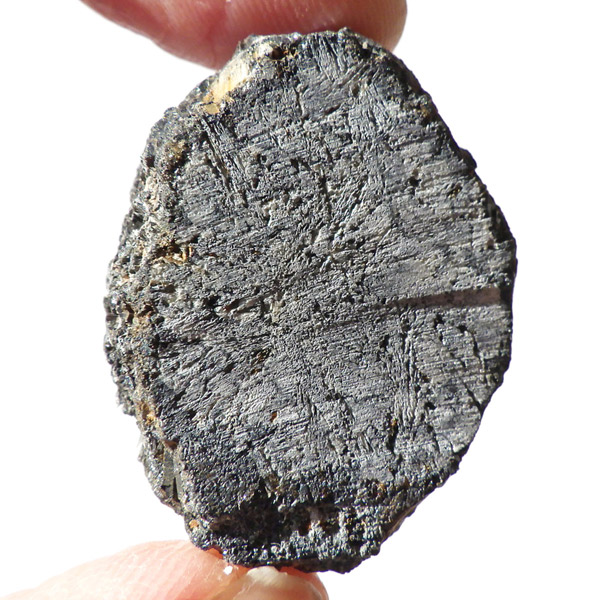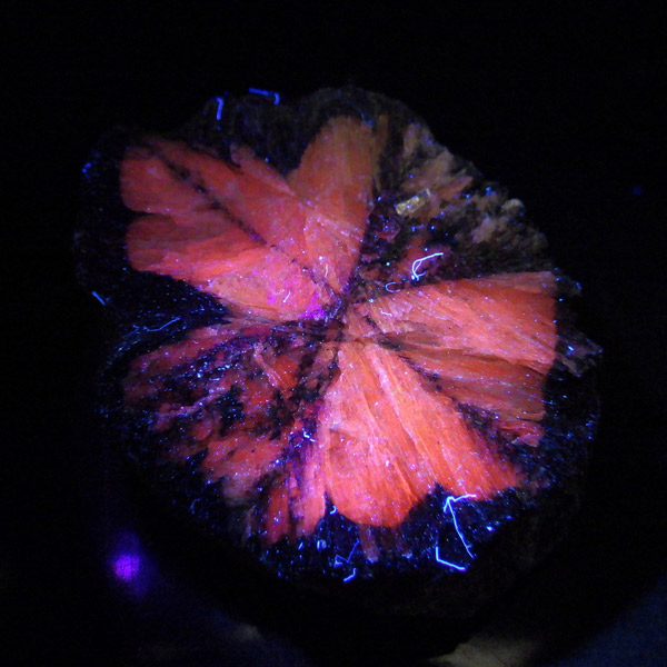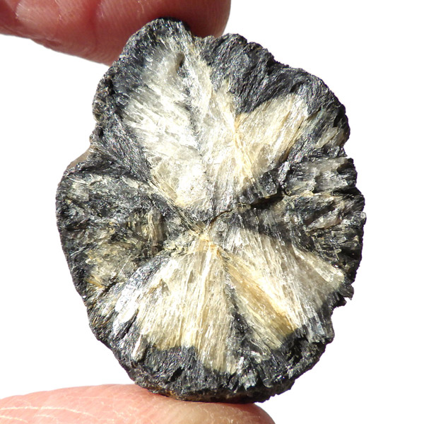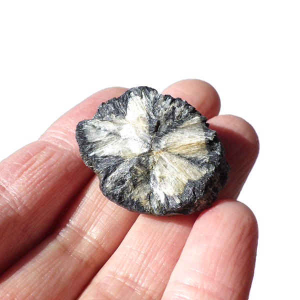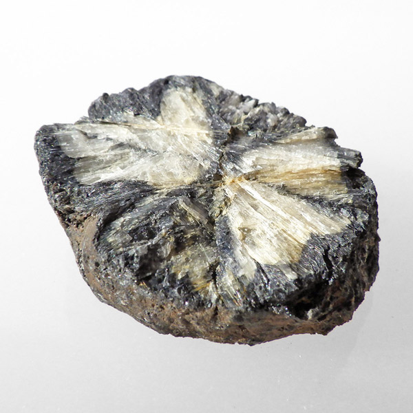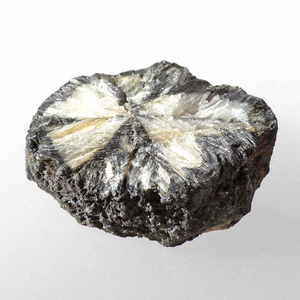ロシア産、キャストライト原石です。キャストライトは黒の十字模様が大変魅力的な石です。キャストライトの名前は、輪切りにすると黒い十字の模様が現れることから、ギリシャ語で「対角線的な配列」という意味の「Chiastos」に由来しています。キャストライトは、黒鉛(グラファイト)などの黒色含有物を対称的に含んだ紅柱石です。クロスストーンとも呼ばれ、粘板岩と花こう岩の接触部に産出します。劈開がありますのできれいに輪切りができます。紅柱石部分は主に白色の集合で光沢があります。きれいな十字に結晶する様に鉱物の神秘を感じますね。365nmのUVライトで赤色の蛍光を確認しました。