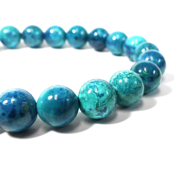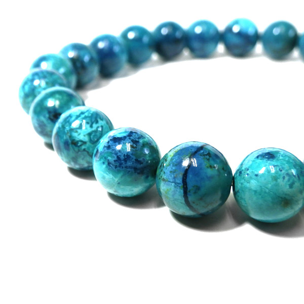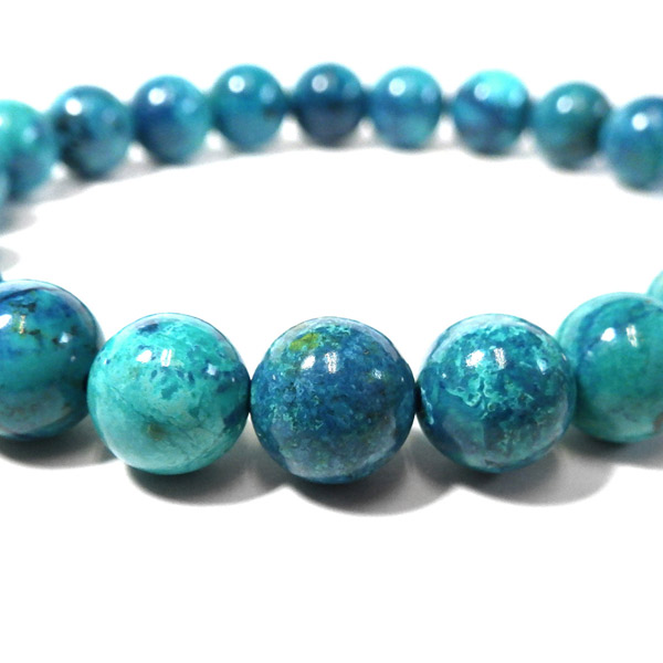 シャッタカイトクリソコラを使用したブレスレットです。 ブルー系のシャッタカイトを含んだクリソコラになります。マラカイトなどのグリーン系のクリソコラとは区別して、シャッタカイトクリソコラと呼んでいます。非常に色味の揃った高品質なブレスレットでとても爽やかな印象です。ビーズ1つ1つに表情があり、とても素敵なブレスレットになっております。