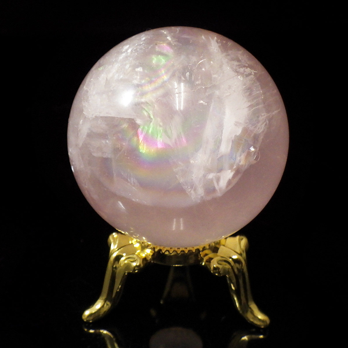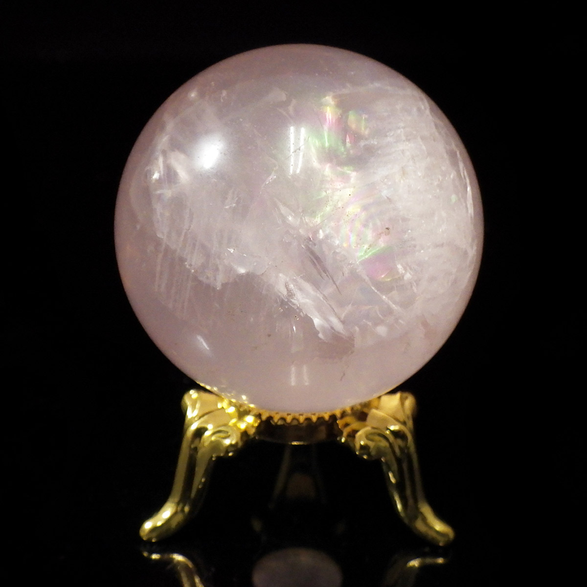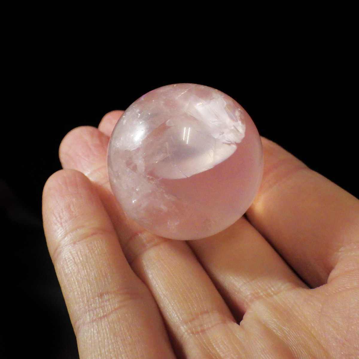 ブラジル産アイリスローズクォーツの球です。直径は35mmでやさしい色合いのミルキーピンクが特徴的です。ほんのりピンクでなんとも心が癒されます。大きな面で確実にレインボーが入っております。光量のあるライトで照らすとスターも見られます。くるくる回して探してみて下さい。透明度が高いローズクォーツで非常におすすめです。