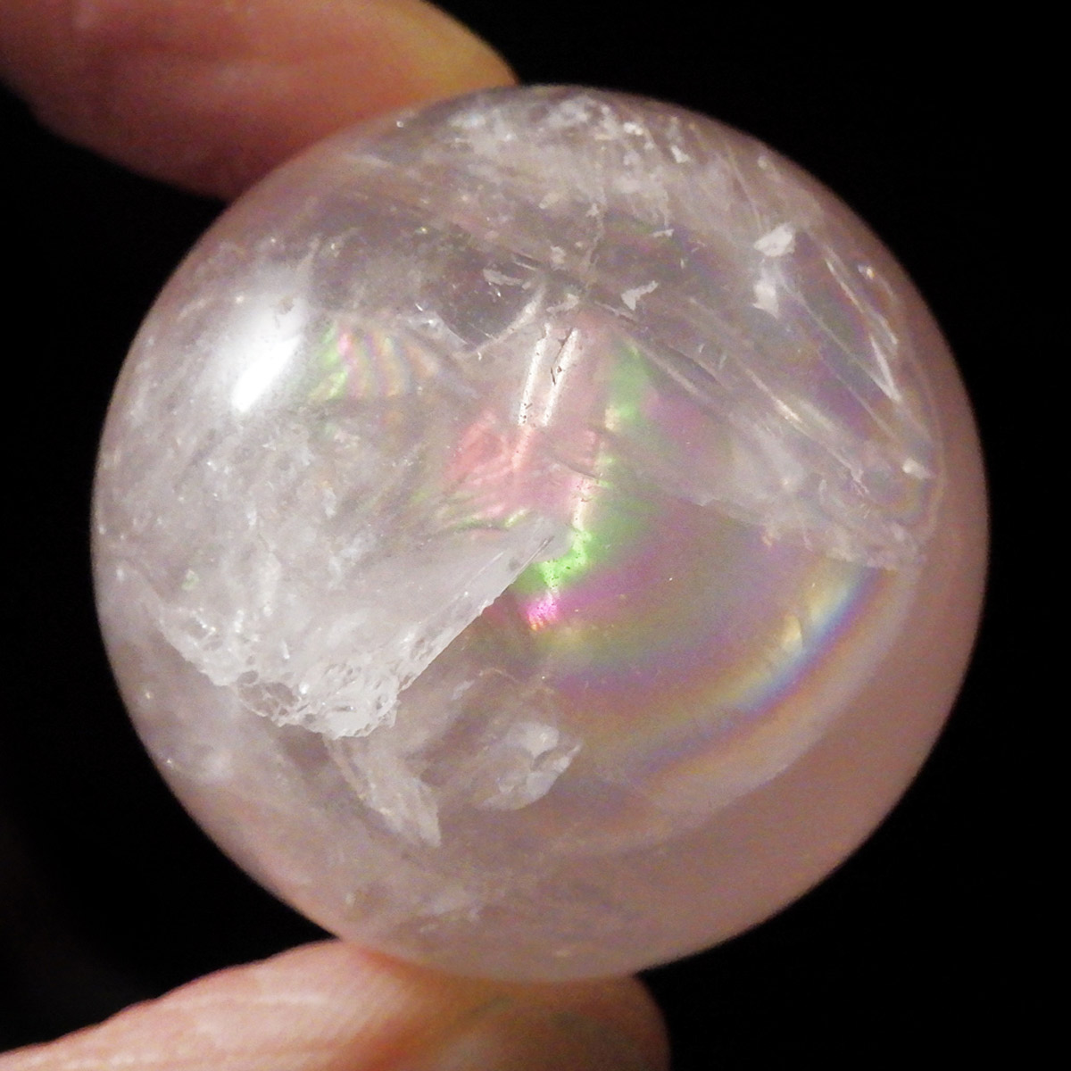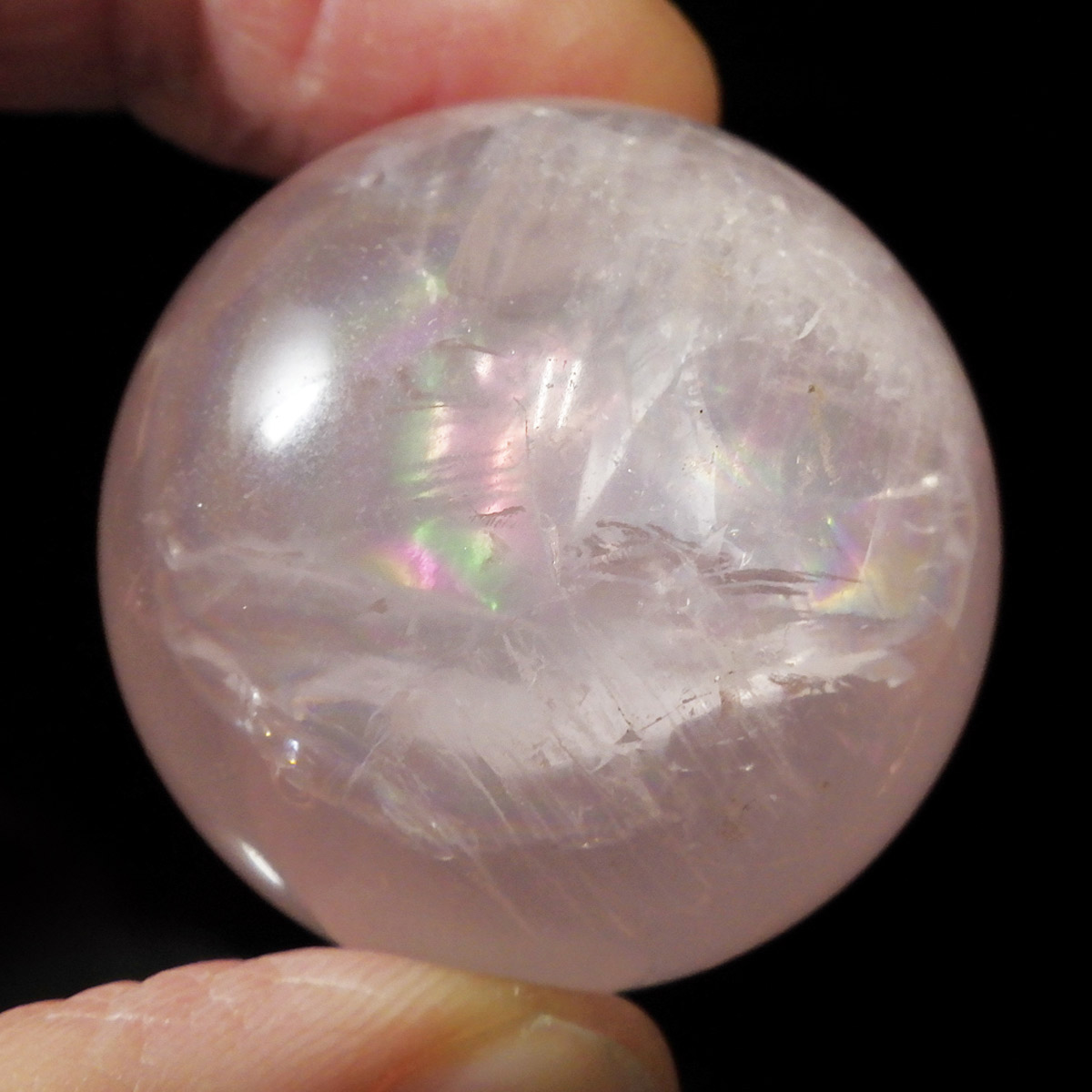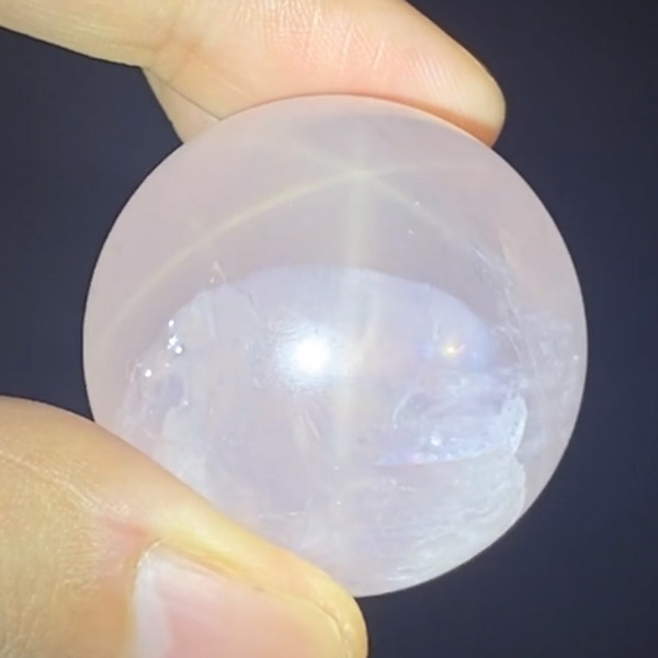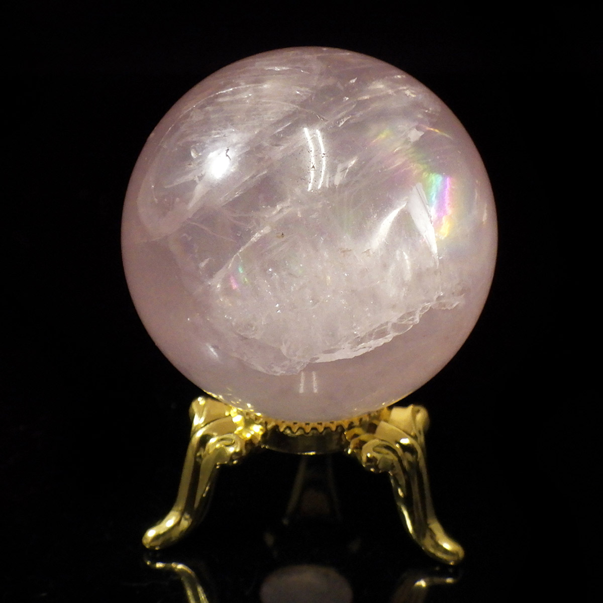 ブラジル産アイリスローズクォーツの球です。直径は35mmでやさしい色合いのミルキーピンクが特徴的です。ほんのりピンクでなんとも心が癒されます。大きな面で確実にレインボーが入っております。光量のあるライトで照らすとスターも見られます。くるくる回して探してみて下さい。透明度が高いローズクォーツで非常におすすめです。