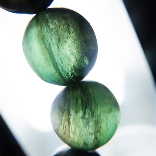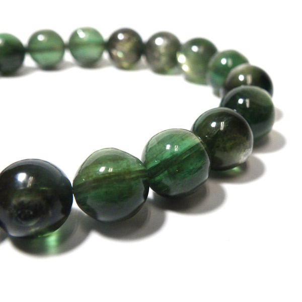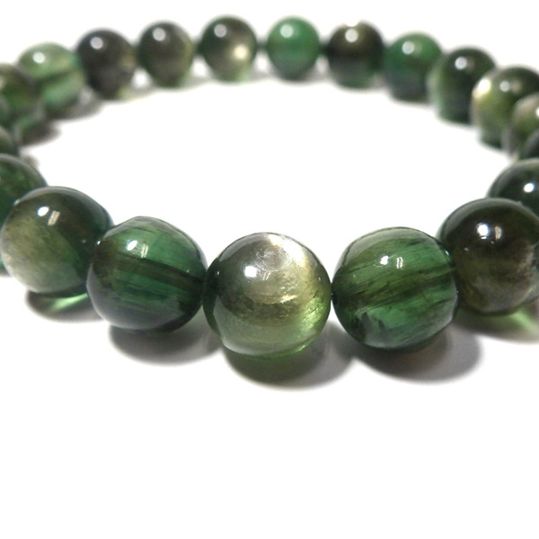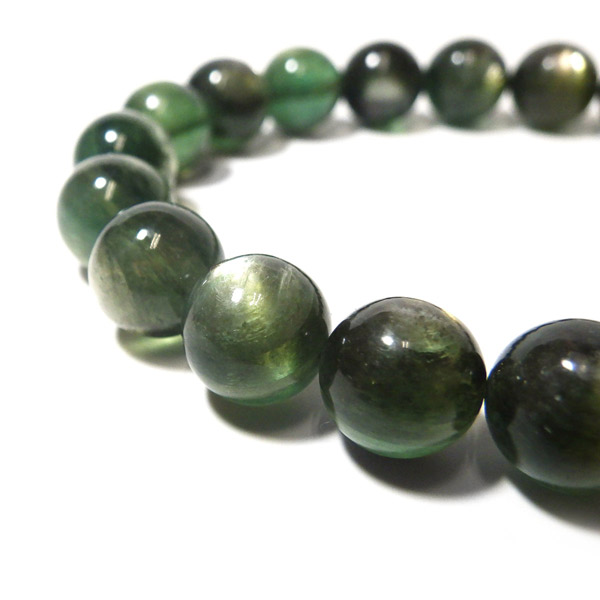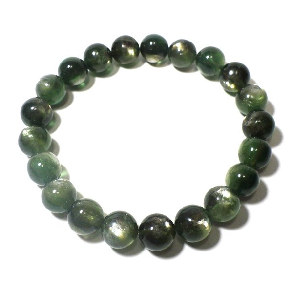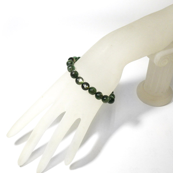 アフガニスタン産、グリーンマイカのブレスレットです。 深みのあるグリーンのマイカで、マイカのシラーが美しく輝きます。光を受けて輝く光沢がとてもきれいです。透明感もあり、光に透かすと幻想的で、これまたきれいです。
