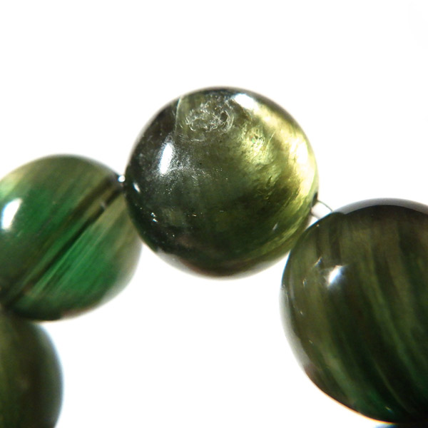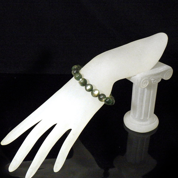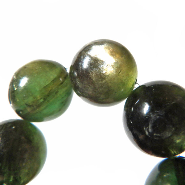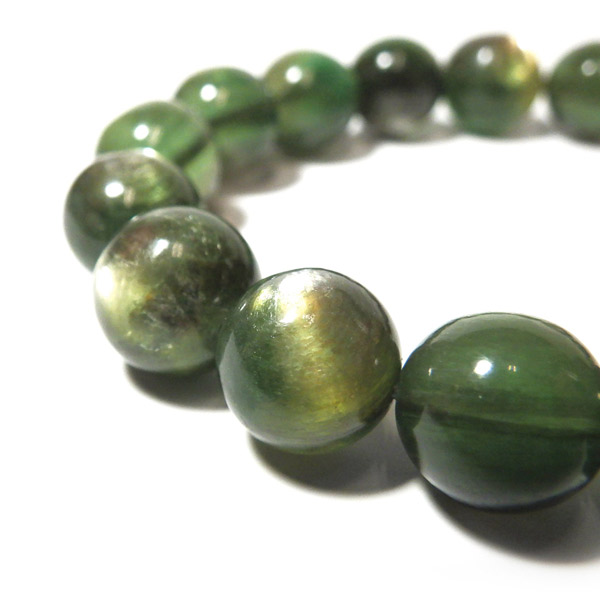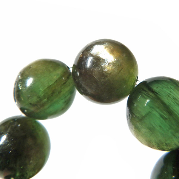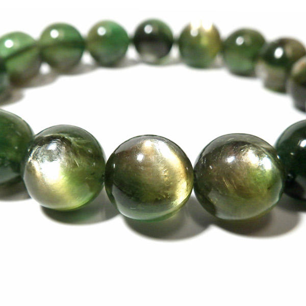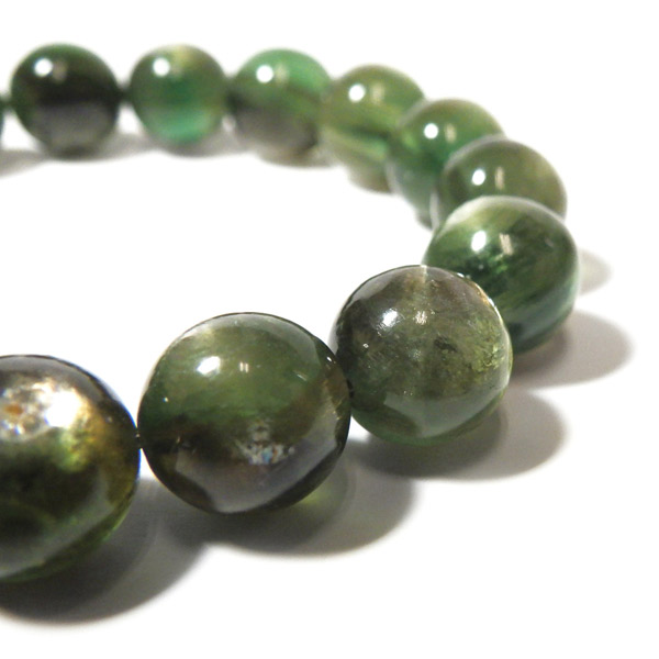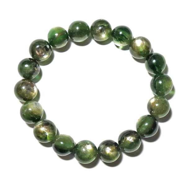 アフガニスタン産、グリーンマイカのブレスレットです。 深みのあるグリーンのマイカで、マイカのシラーが美しく輝きます。光を受けて輝く光沢がとてもきれいです。透明感もあり、光に透かすと幻想的で、これまたきれいです。