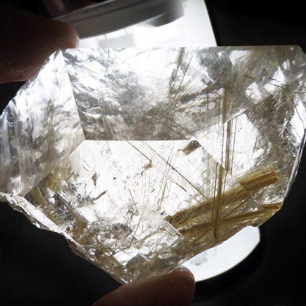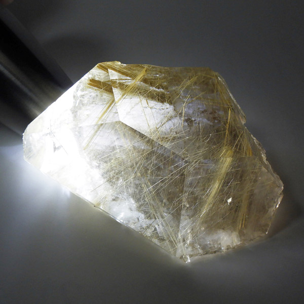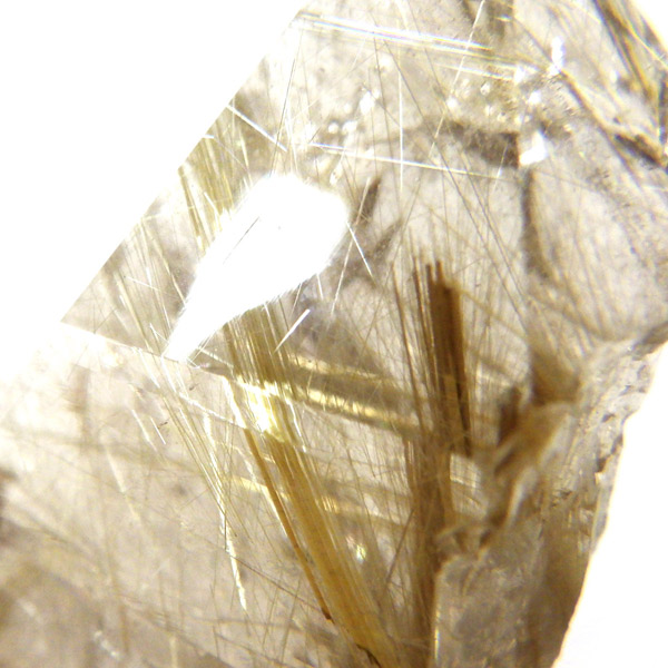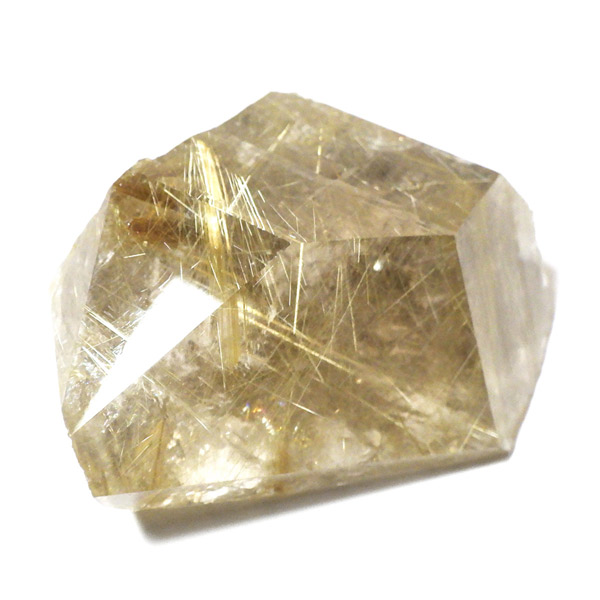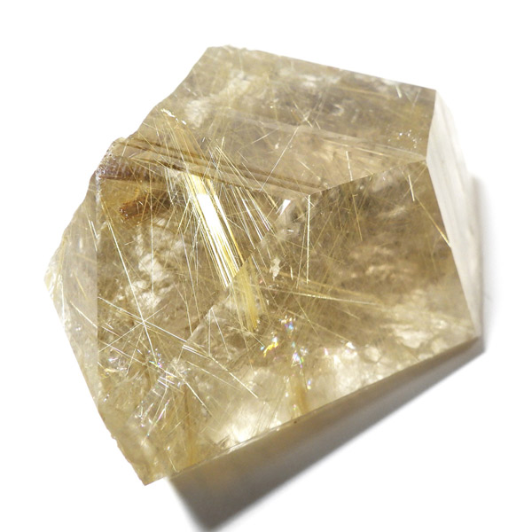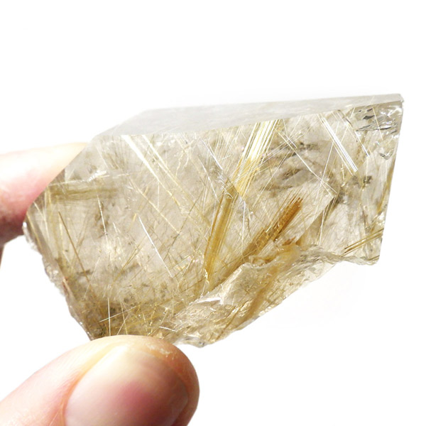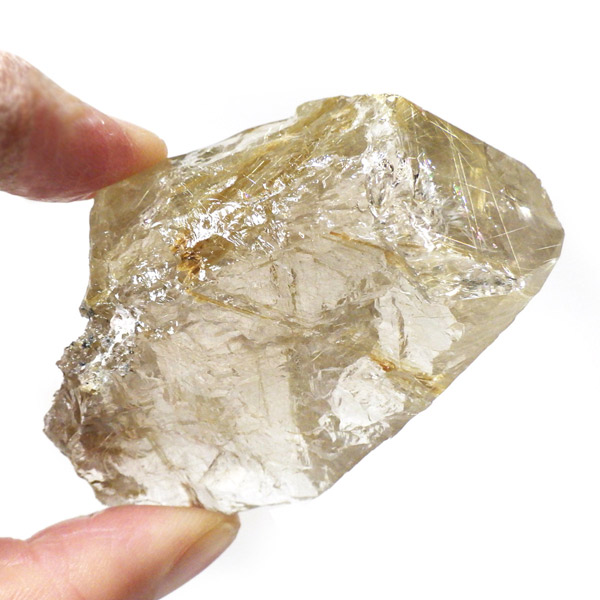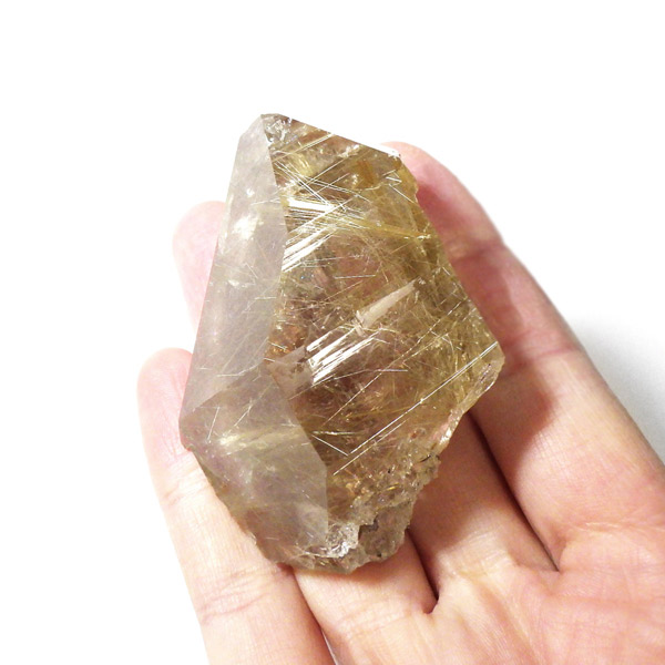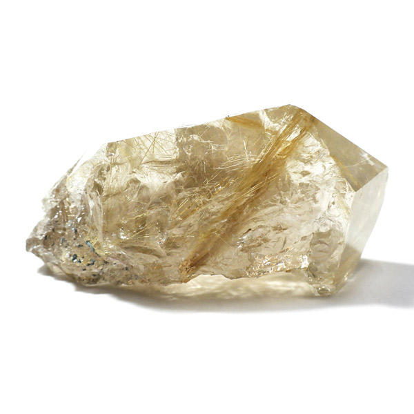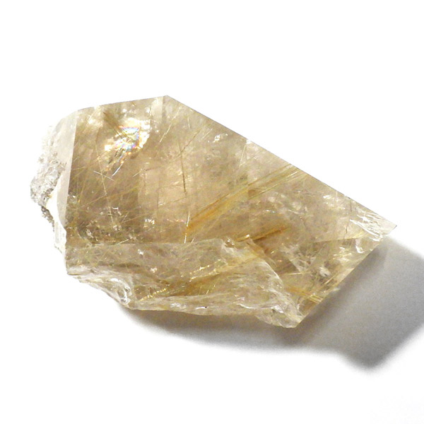 透明度の高いクォーツ内にルチルのゴールドの針がしっかりと入っています。磨きのないポイント原石タイプで、表面には成長線やレコードキーパーも見られます。内部にはレインボー、さらに長くて綺麗な針のルチルも見られ、角度を変えるとキラキラと大変魅力的です。角度によってその表情がどんどん変わり、魅力的な美しいルチルクォーツです。