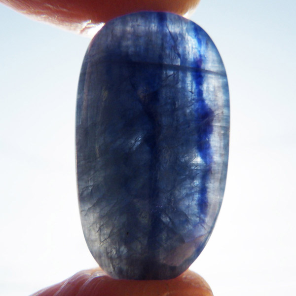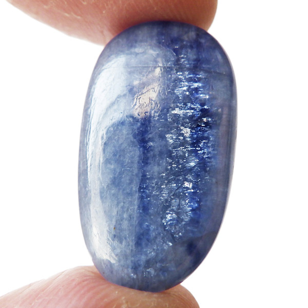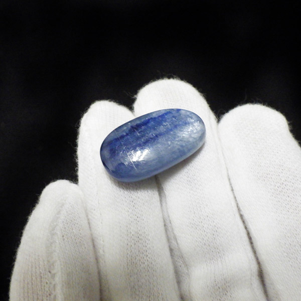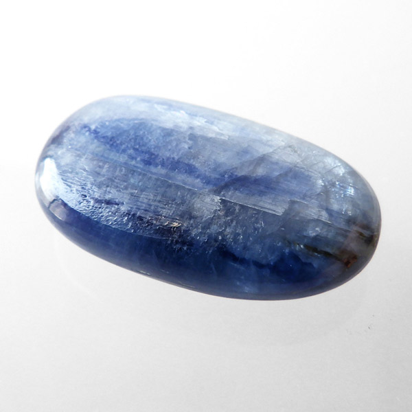 ブラジル産のカイヤナイト、タンブルです。カイヤナイトはブルーがきれいな人気の鉱物です。カイヤナイトの独特のブルーは、サファイアと同じく、含まれる鉄とチタンが要因となっています。角度を変えると光を反射し、キラキラとしたシラーの輝きとブルーのグラデーションが美しいです。