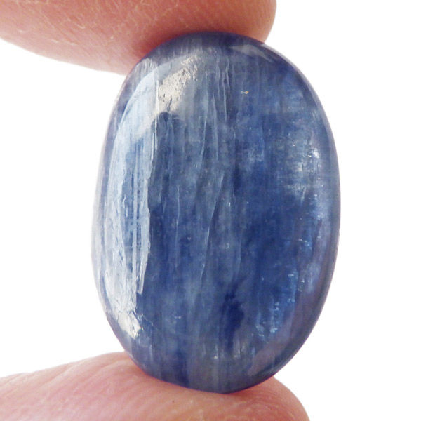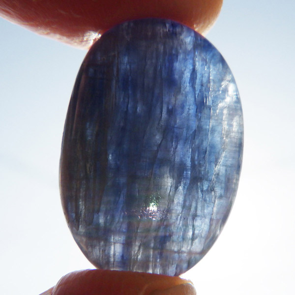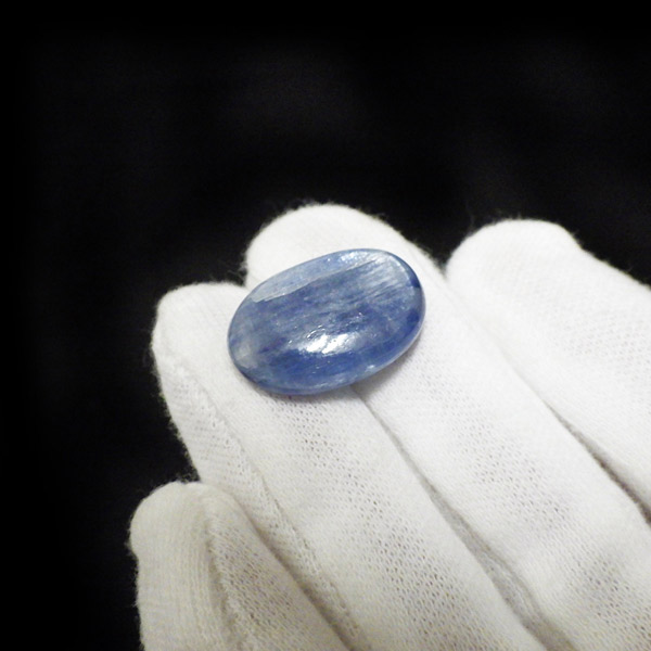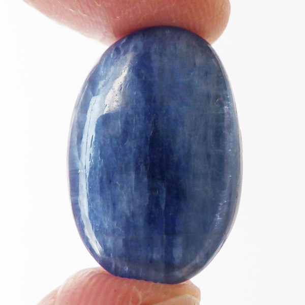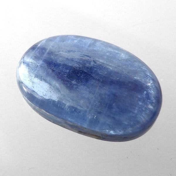 ブラジル産のカイヤナイト、タンブルです。カイヤナイトはブルーがきれいな人気の鉱物です。カイヤナイトの独特のブルーは、サファイアと同じく、含まれる鉄とチタンが要因となっています。角度を変えると光を反射し、キラキラとしたシラーの輝きとブルーのグラデーションが美しいです。