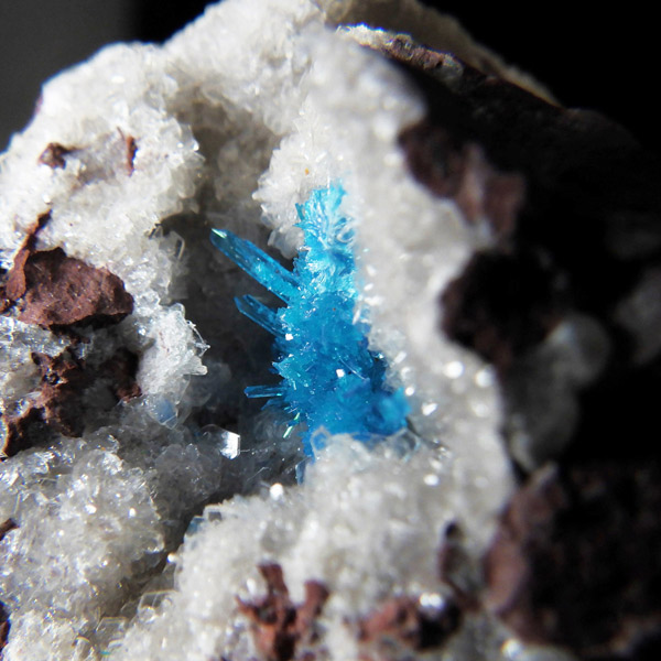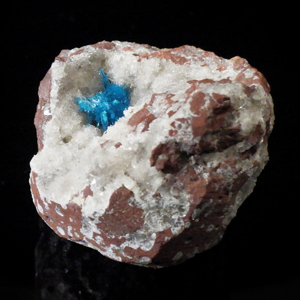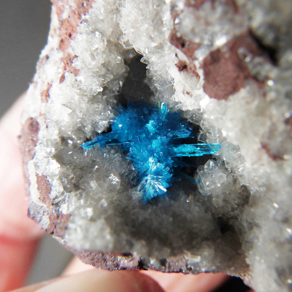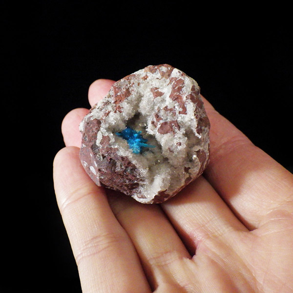 インド、プネー産のカバンサイト原石です。カバンサイトは、沸石の中でも人気を誇る、美しいビビッドな青い発色が魅力的です。主成分の、「カルシウム」「バナジウム」「シリコン」の3つの頭文字をつなげて「カバンサイト」と付けられたのが名前の由来です。少し窪んだ母岩の隙間に青く伸びる結晶がとても美しいです。質の良いカバンサイトで透明感のある濃い青の繊細な結晶を有しています。母岩に付いている細かな輝沸石もキラキラとしてより魅力を増しています。