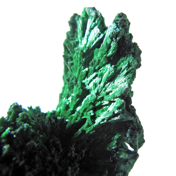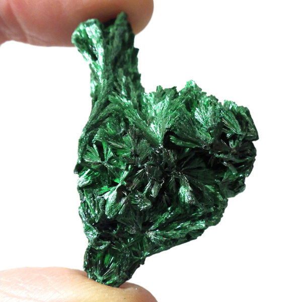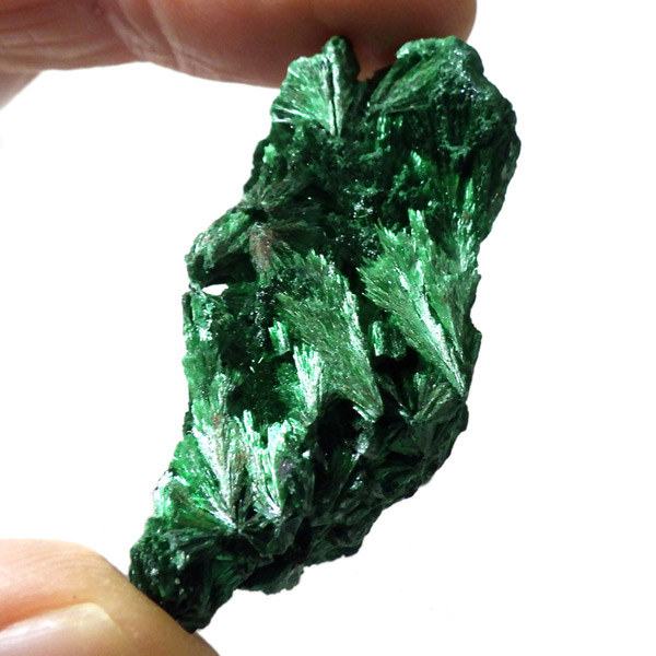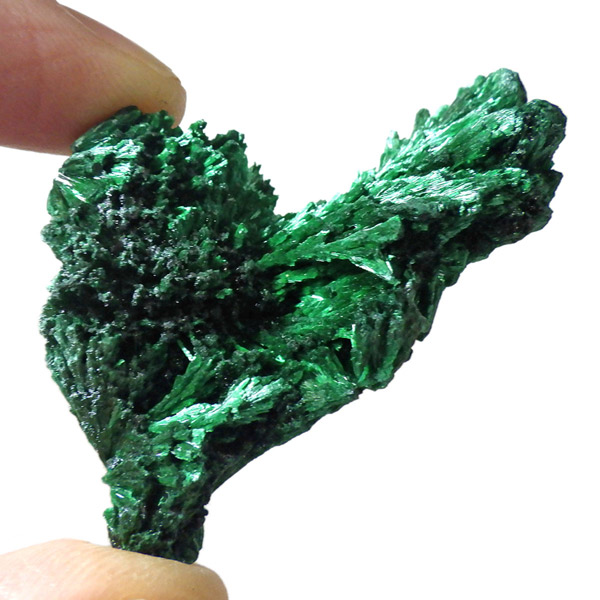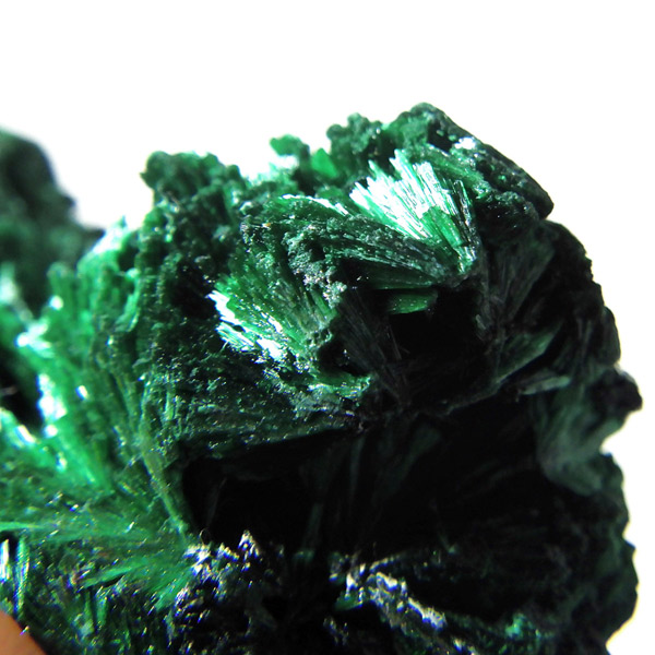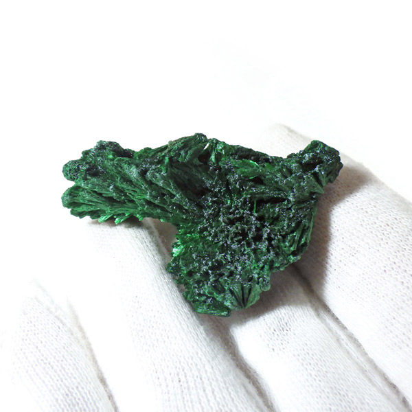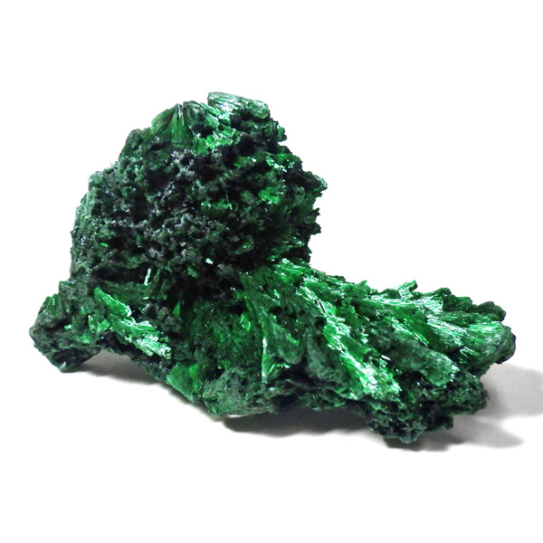 コンゴ産のマラカイト原石です。繊維状の結晶が集まった美しい一品で、ベルベットのような光沢があります。艶やかに光るきれいなグリーンで、一見脆そうに見えますが触ってみるとしっかりした結晶です。照り・艶・色味がトップクラスに美しいマラカイトの結晶になっております。
