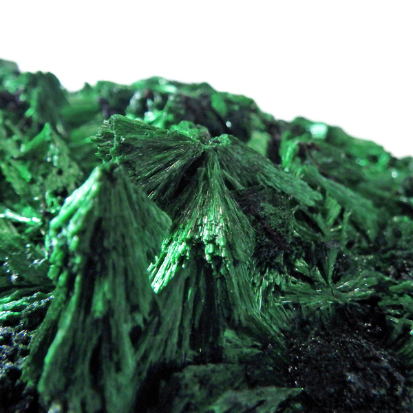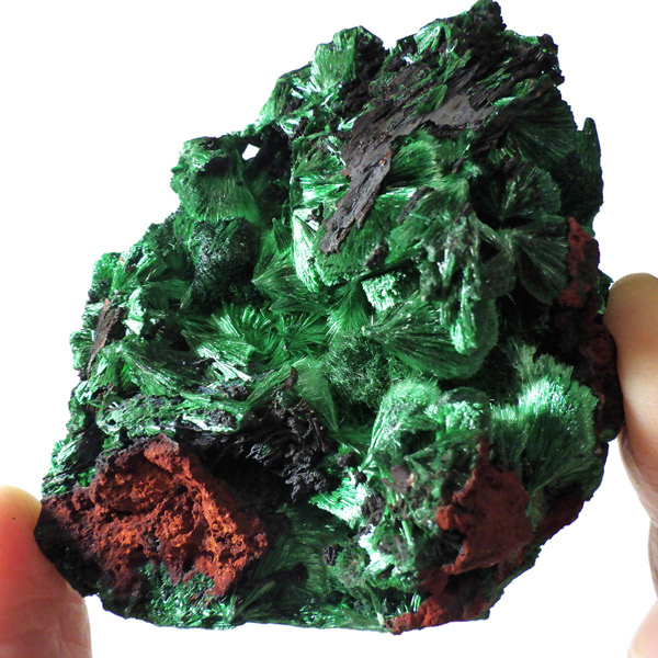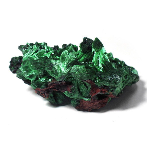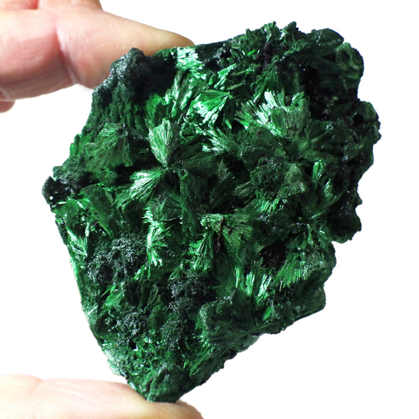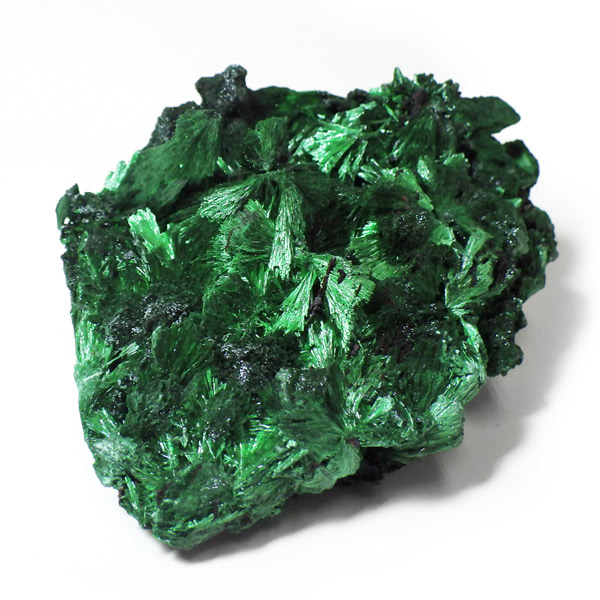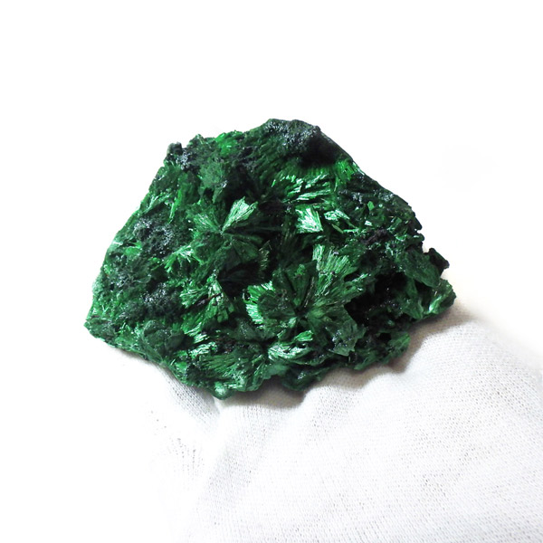コンゴ産のマラカイト原石です。繊維状の結晶が集まった美しい一品で、ベルベットのような光沢があります。艶やかに光るきれいなグリーンで、一見脆そうに見えますが触ってみるとしっかりした結晶です。照り・艶・色味がトップクラスに美しいマラカイトの結晶になっております。