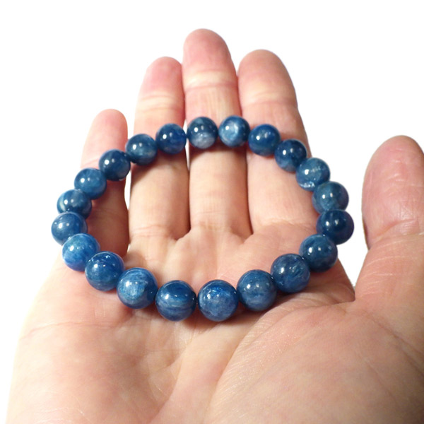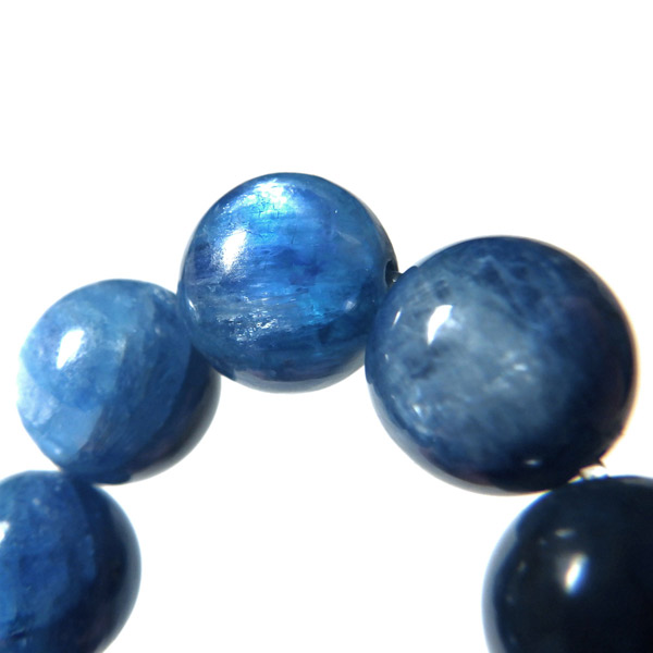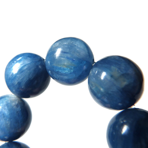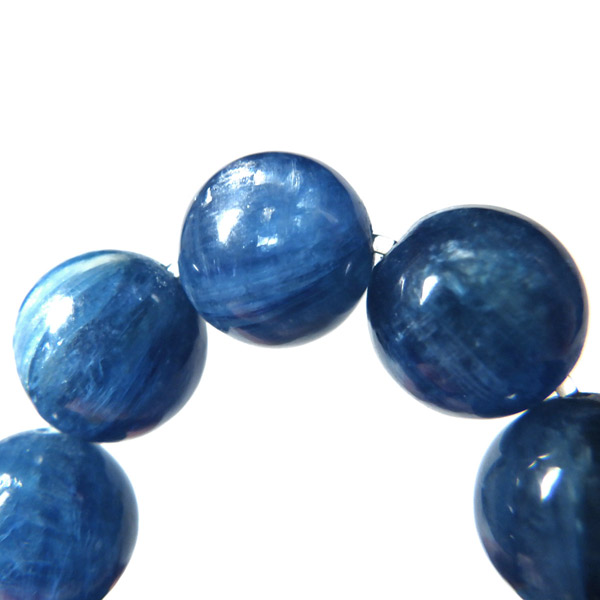 ブラジル産、高品質カイヤナイトのブレスレットです。カイヤナイトの独特のブルーは、サファイアと同じく、含まれる鉄とチタンが要因となっています。 外見だけではブルーサファイアと見間違うこともあります。見た目にも一つの方向に繊維がはっきりと伸びている感じなのですが、カイヤナイトを磨いた玉等はまるで宇宙から見た地球を思わせるような、深く美しいブルーのグラデーションが美しい石です。