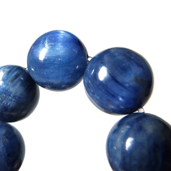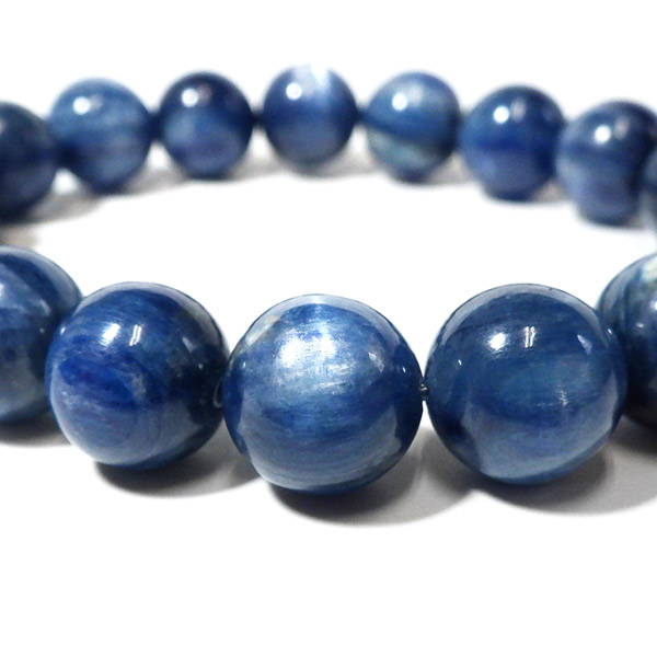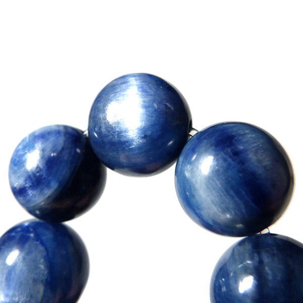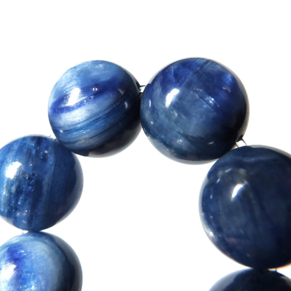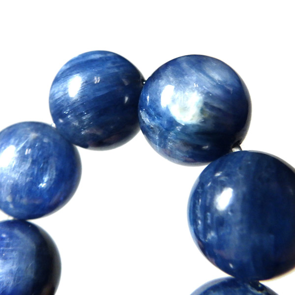 ブラジル産、高品質カイヤナイトのブレスレットです。カイヤナイトの独特のブルーは、サファイアと同じく、含まれる鉄とチタンが要因となっています。 外見だけではブルーサファイアと見間違うこともあります。見た目にも一つの方向に繊維がはっきりと伸びている感じなのですが、カイヤナイトを磨いた玉等はまるで宇宙から見た地球を思わせるような、深く美しいブルーのグラデーションが美しい石です。