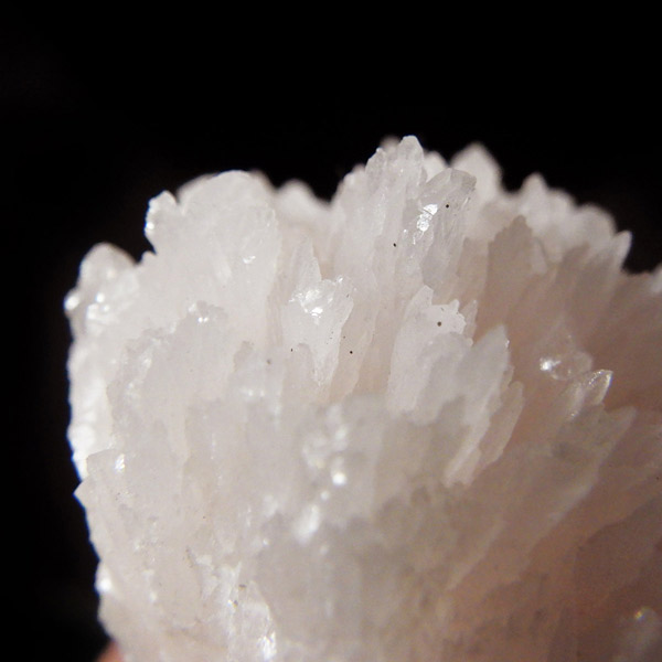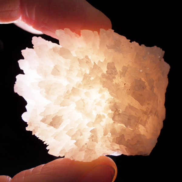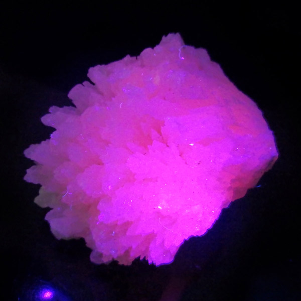 ペルー産ピンクカルサイト原石です。ピンクカルサイトはカルサイトの仲間です。マンガンが入っているので、淡く美しく、優しいピンク色になります。マンガンが含まれることにより、ブラックライトを当てると幻想的なピンク色に発光します。細やかに伸びた結晶が集合した美しい標本です。
