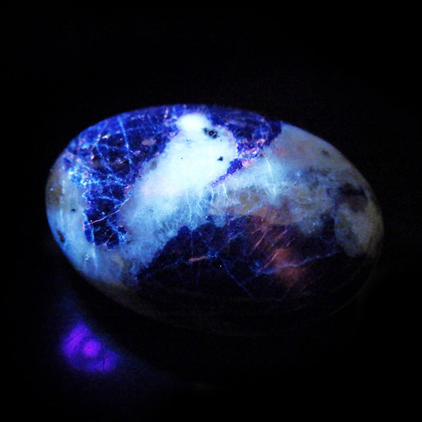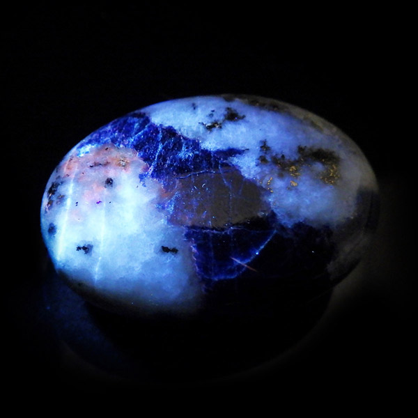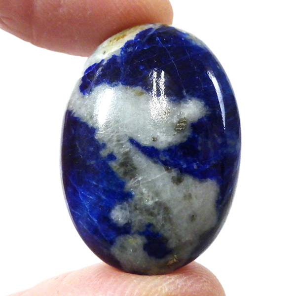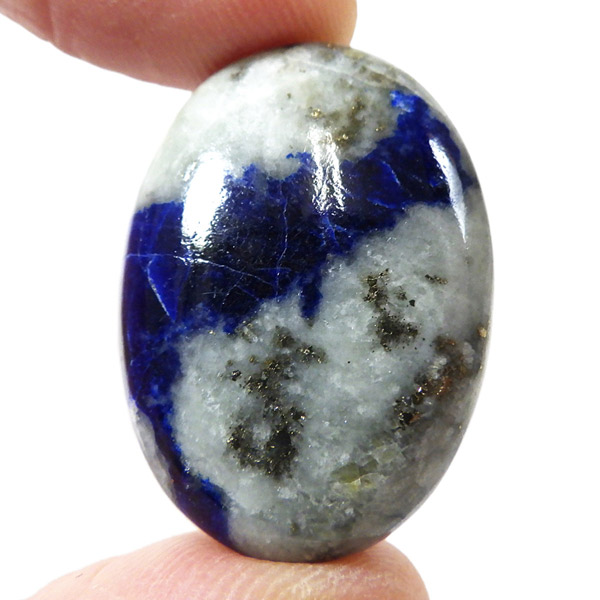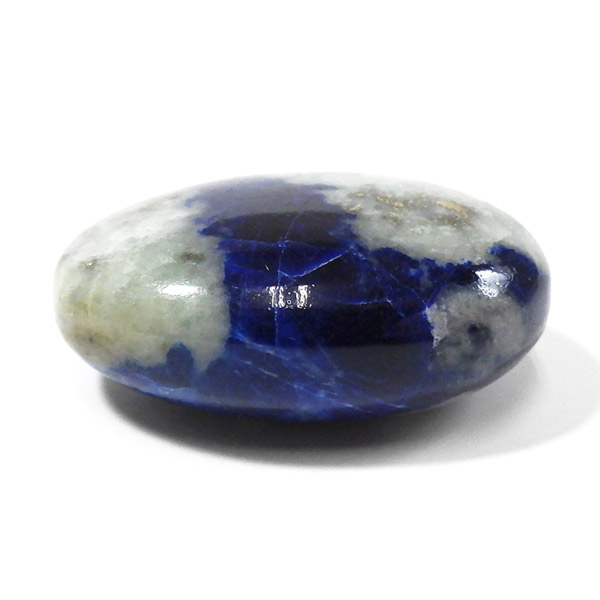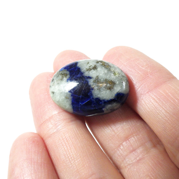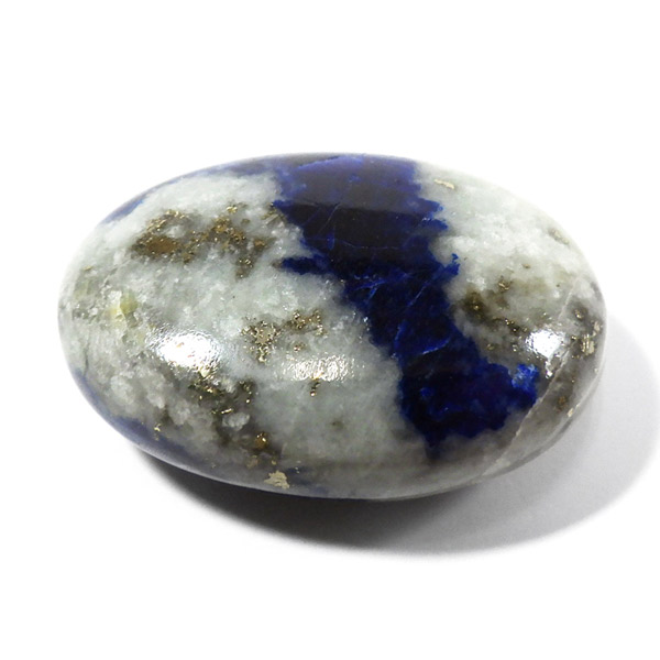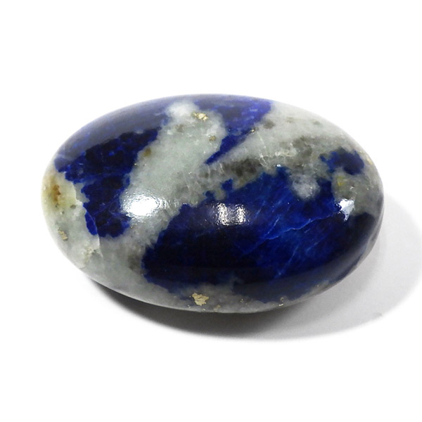 アフガニスタン産、高品質なアフガナイトのタンブルです。アフガナイトは産出国名にちなんで名付けられています。アフガナイトは、準長石のカンクリナイトグループに属する鉱物です。鮮やかな青色が特徴的です。主に青・無色・緑などのカラーを持ちます。また、アフガナイトの特徴として蛍光性があります。劈開性が完全のため衝撃に弱く、磨くのが難しい石とされています。こちらのタンブルにはアフガナイト、ラズライト、カルサイト、パイライトなどが含まれています。