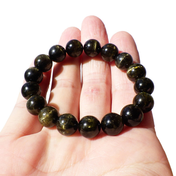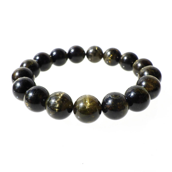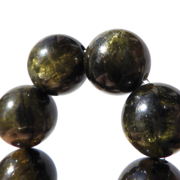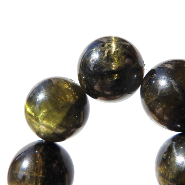濃いイエローグリーン~ブラックカラーのトルマリンですが、全ての玉にキャッツアイ効果が確認できる、貴重なブレスレットです。キャッツアイ効果は、猫の目のように明るい光の筋が見える現象のことをいいます。トルマリンキャッツアイの場合は、繊維状の結晶が平行にびっしりとに並ぶことで初めて出現します。ペンライトなどでご覧いただくと、よりハッキリとキャッツアイが現れます。また、透明度も高くツヤツヤとした石の表面が魅力的です。
