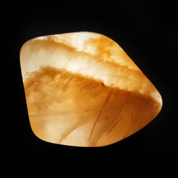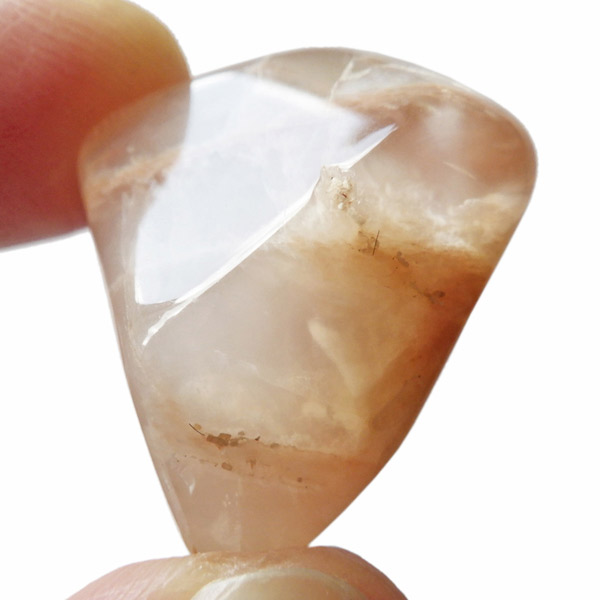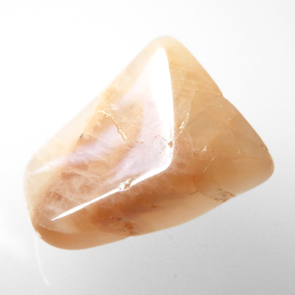 インド産のオレンジムーンストーンです。ムーンストーンは長石(フェルドスパー)という鉱物グループの一種で、和名を月長石といいます。石の内部にある層が光を乱反射して出現する真珠のような柔らかい光の効果を「シラー効果」と呼び、ムーンストーンに見られる特徴です。その光の色は青白いものから、ピンク、オレンジ、白、グレーなど様々です。