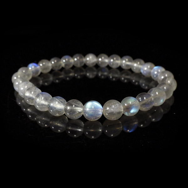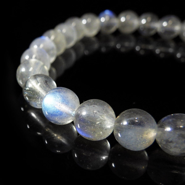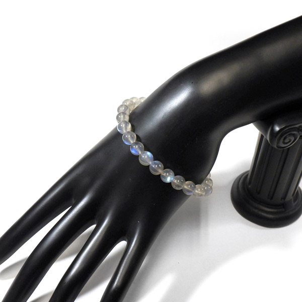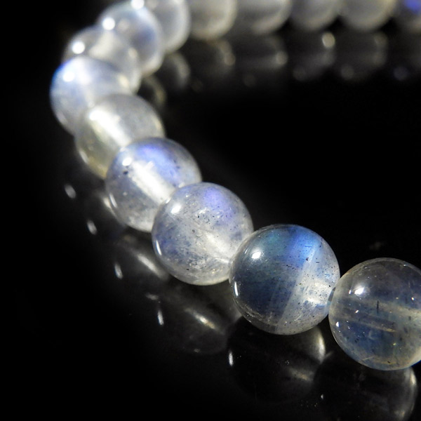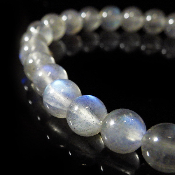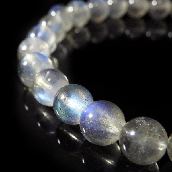 マダガスカル産、ラブラドライトのブレスレットです。 見る角度によってブルーを中心とした色彩を変える光が特徴的です。石自体は透明感のあるグレーの色合いをしていますが、そこに鮮やかな輝きが浮かび上がるところから「アゲハ蝶の羽」に例えられる事もある美しい石です。
