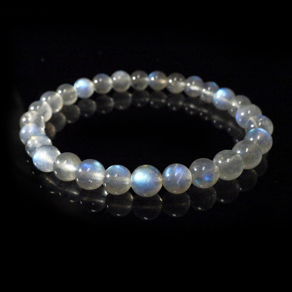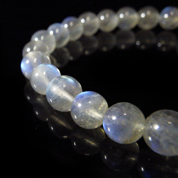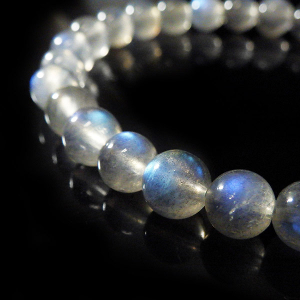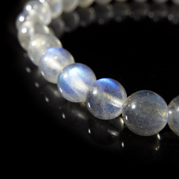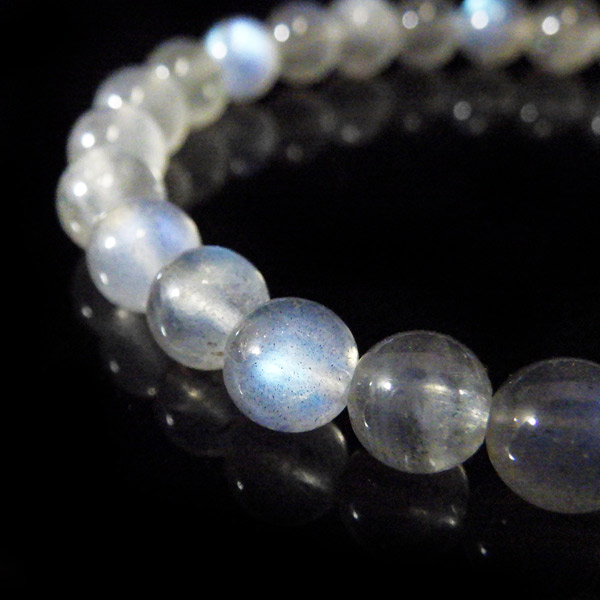 マダガスカル産、ラブラドライトのブレスレットです。 見る角度によってブルーを中心とした色彩を変える光が特徴的です。石自体は透明感のあるグレーの色合いをしていますが、そこに鮮やかな輝きが浮かび上がるところから「アゲハ蝶の羽」に例えられる事もある美しい石です。