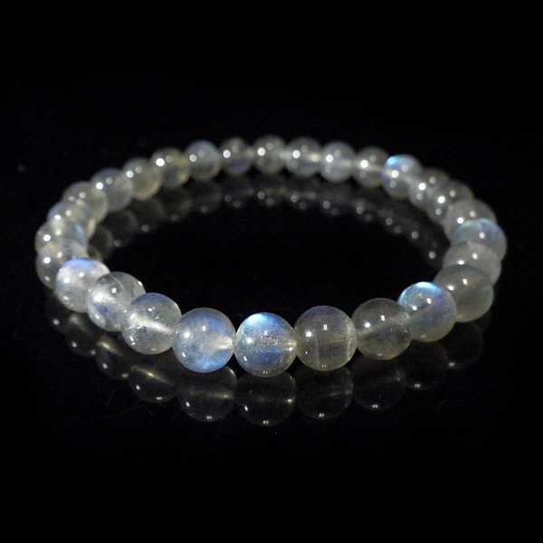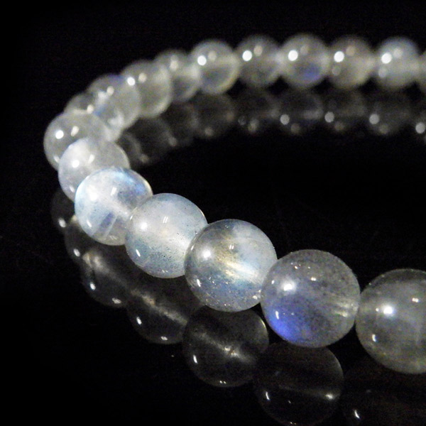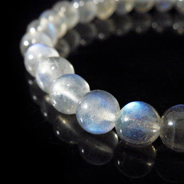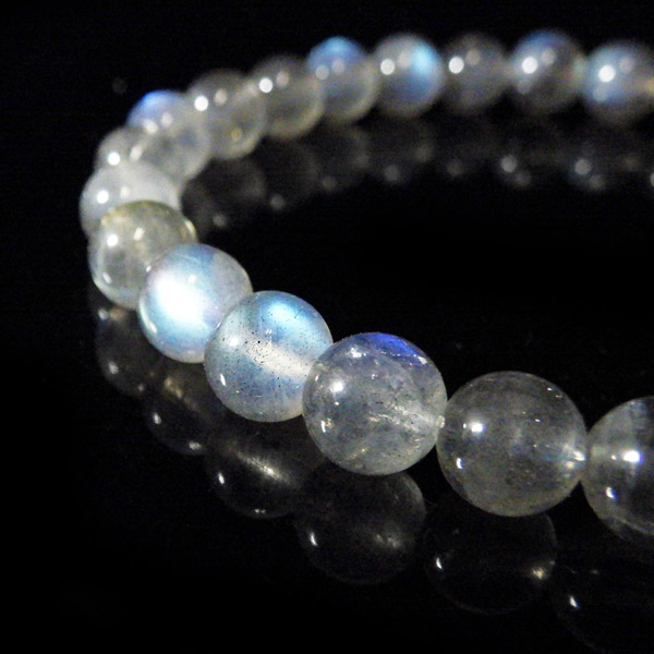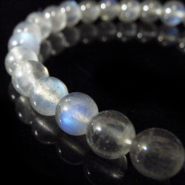 マダガスカル産、ラブラドライトのブレスレットです。 見る角度によってブルーを中心とした色彩を変える光が特徴的です。石自体は透明感のあるグレーの色合いをしていますが、そこに鮮やかな輝きが浮かび上がるところから「アゲハ蝶の羽」に例えられる事もある美しい石です。