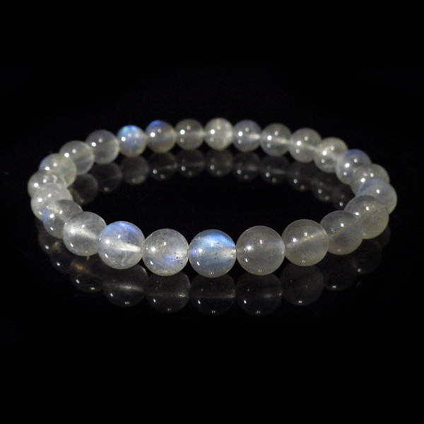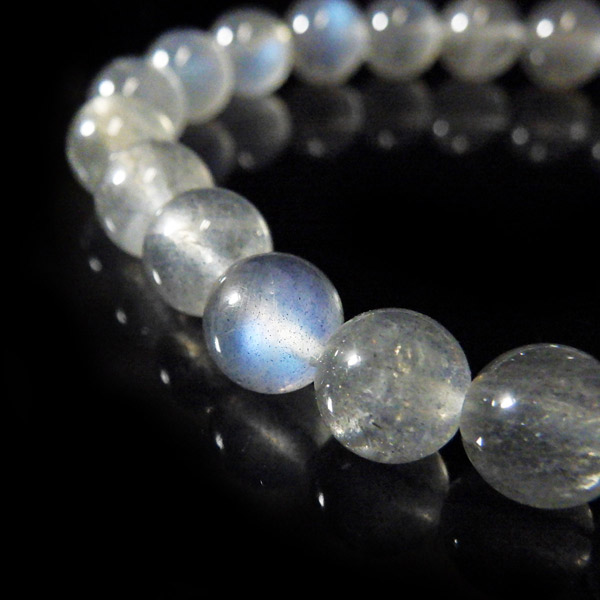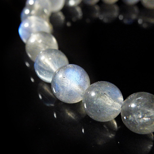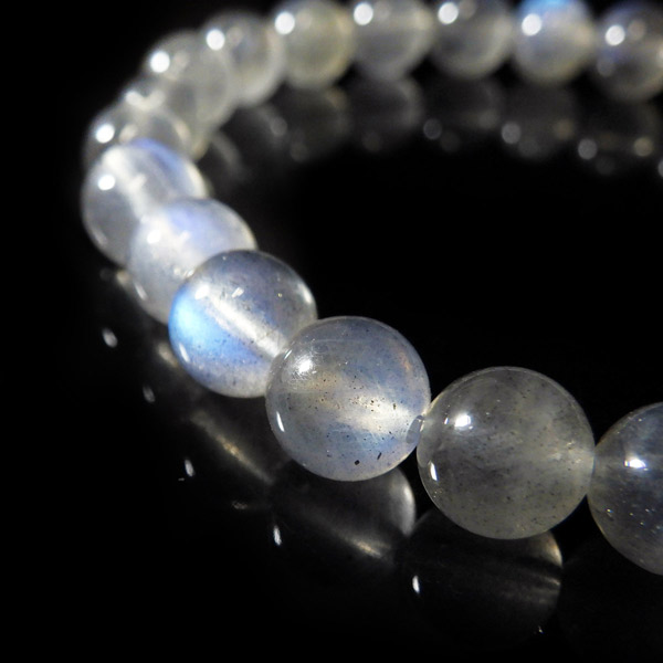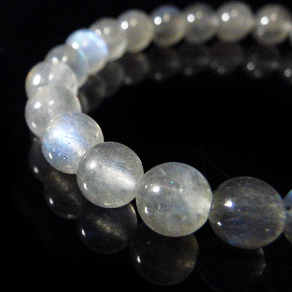 マダガスカル産、ラブラドライトのブレスレットです。 見る角度によってブルーを中心とした色彩を変える光が特徴的です。石自体は透明感のあるグレーの色合いをしていますが、そこに鮮やかな輝きが浮かび上がるところから「アゲハ蝶の羽」に例えられる事もある美しい石です。