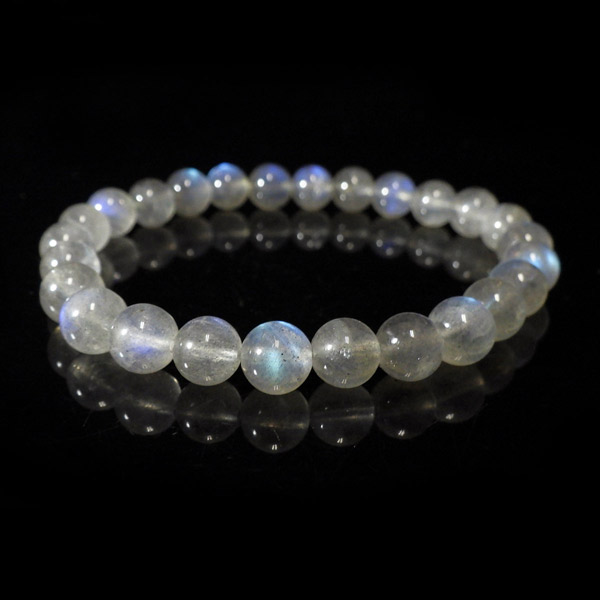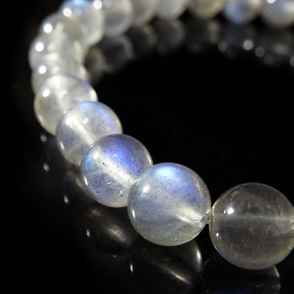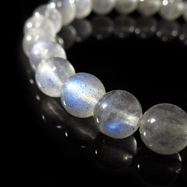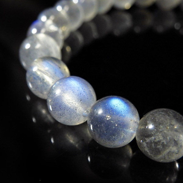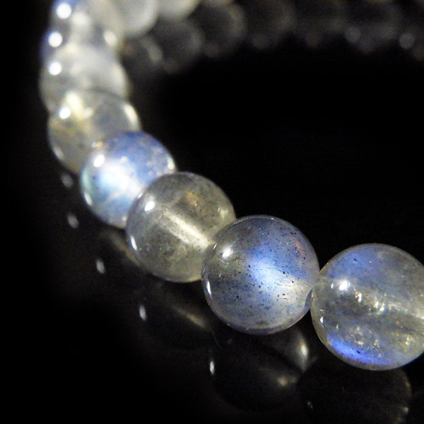 マダガスカル産、ラブラドライトのブレスレットです。 見る角度によってブルーを中心とした色彩を変える光が特徴的です。石自体は透明感のあるグレーの色合いをしていますが、そこに鮮やかな輝きが浮かび上がるところから「アゲハ蝶の羽」に例えられる事もある美しい石です。