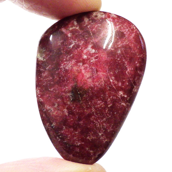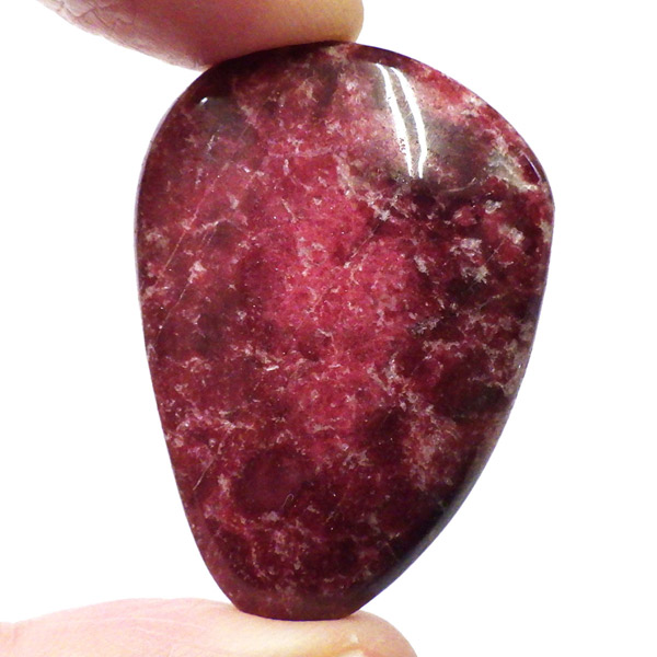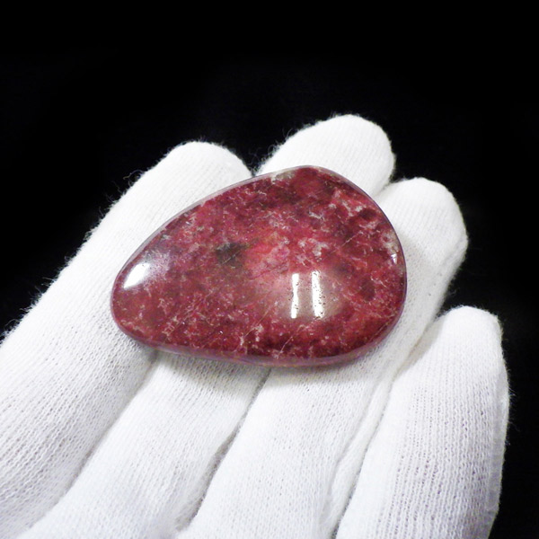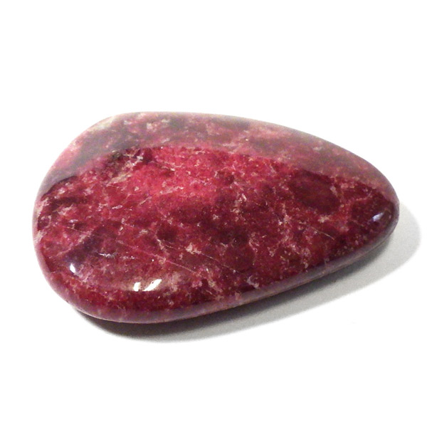ノルウェー産チューライト、磨きペブルです。赤みの発色の良い高品質なチューライトです。深紅といった色合いがぴったりでしょうか。手のひらで包めるような大きさで平たく磨いております。チューライトは、ノルウェーなど、限られた地域のみで産出される、希少な石です。タンザナイト等も含まれるゾイサイトグループのバリエーションの一つで、その中でもピンク~赤色をしているものをさします。緑色をしているものは「アニョライト」、青色をしているものは「タンダナイト」と分類されます。その赤色の発色は、含まれる鉄とマンガンに起因しています。