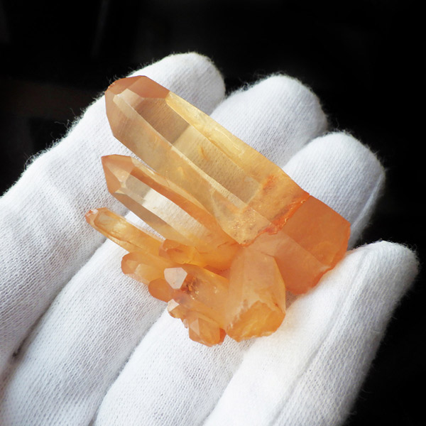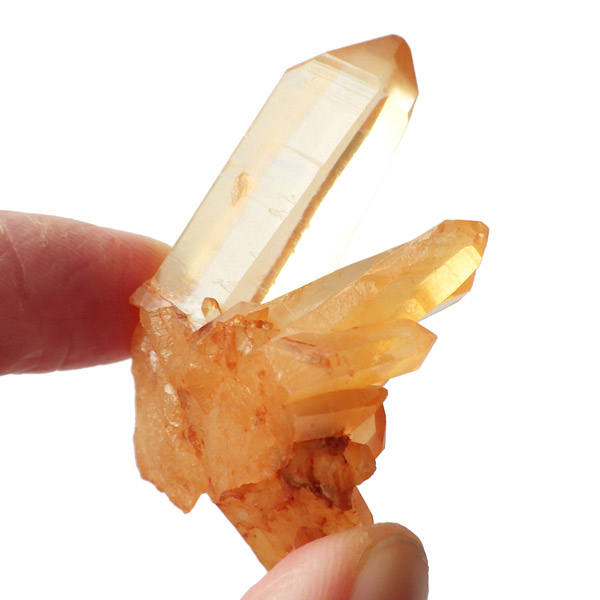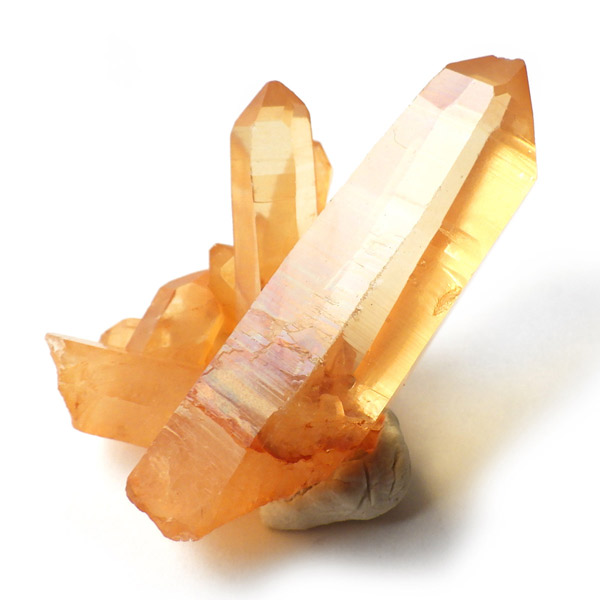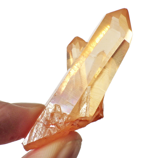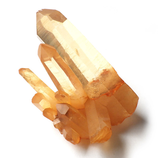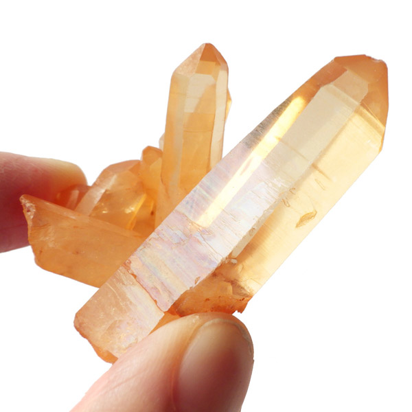 ブラジル産のゴールデンヒーラータンジェリンクォーツ、クラスターです。タンジェリンクォーツとはオレンジ色に色づいた美しい水晶です。このオレンジ色は水晶の表面に鉄成分等が付着し、それが酸化してできます。ゴールデンヒーラーはその中でも結晶表面が光の反射でオーラを纏ったようなレインボーに輝く数少ない水晶のことです。透明度もあり、形も良く、非常に美しい水晶です。
