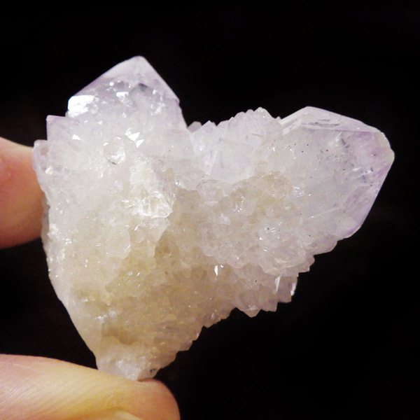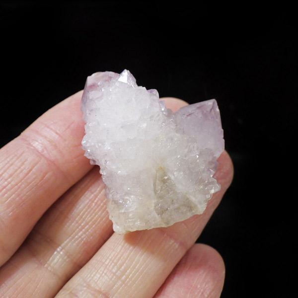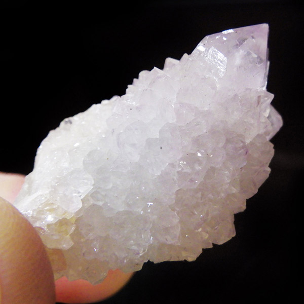 南アフリカ産、カクタスアメジスト原石です。カクタスアメジストは、細かな結晶に包まれるように、先端にポイントが伸びている特徴的なアメジストです。カクタスとは「サボテン」という意味で、見た目がサボテンに似ていることからこの名前がつけられ、サボテン水晶とも言われています。また、古来から精霊の宿る聖なる水晶とも崇められていて、スピリットクォーツとも言われています。細かな淡い結晶で形成されており、光を当てるとキラキラと神秘的な輝きを放ちます。表面の一部が黄色いリモナイト(褐鉄鉱)で覆われており、パープルとイエローのハーモニーが面白いです。主に2つのポイントからなる小さくかわいらしいサイズのアメジストです。