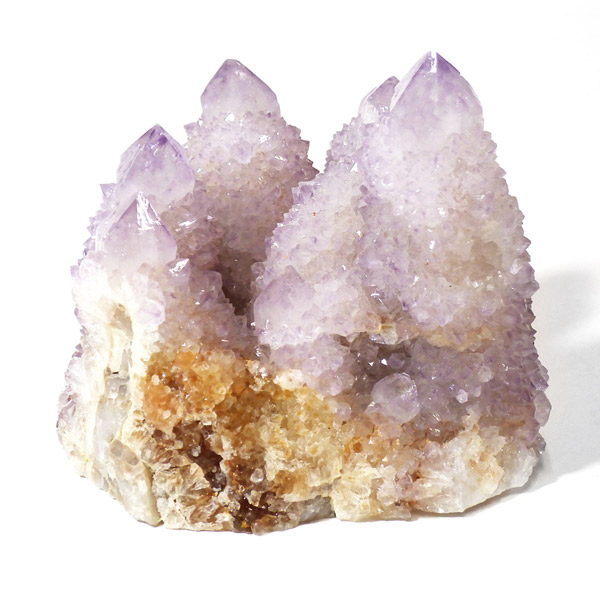 南アフリカ産、カクタスアメジスト原石です。カクタスアメジストは、細かな結晶に包まれるように、先端にポイントが伸びている特徴的なアメジストです。カクタスとは「サボテン」という意味で、見た目がサボテンに似ていることからこの名前がつけられ、サボテン水晶とも言われています。また、古来から精霊の宿る聖なる水晶とも崇められていて、スピリットクォーツとも言われています。細かな淡い結晶で形成されており、光を当てるとキラキラと神秘的な輝きを放ちます。表面の一部が黄色いリモナイト(褐鉄鉱)で覆われており、パープルとイエローのハーモニーが面白いです。