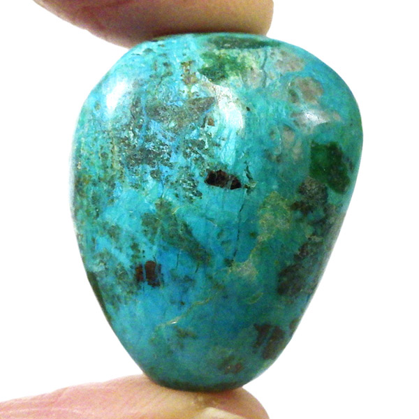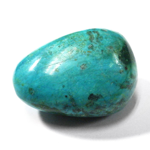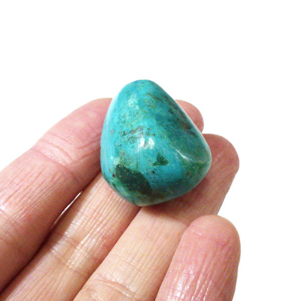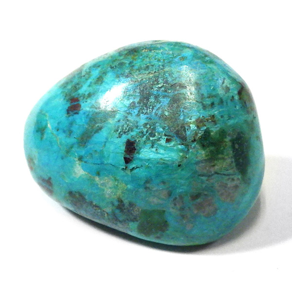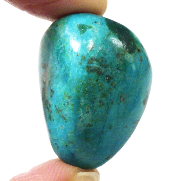 ペルー産のシャッタカイトクリソコラのタンブルです。シャッタカイトは銅のケイ酸塩の水酸化物の鉱物で、1915年に最初に発見されたアメリカのアリゾナ州のシャッタク鉱山が名前の由来です。そこではマラカイトも産出されましたが、マラカイトの結晶を保ったまま成分が入れ替わる、仮晶という現象が起き、それがシャッタカイトとして発見されました。シャッタカイトは奥深い緑みの青から鮮やかな緑みの青が特徴の鉱物です。主に銅鉱床の酸化帯でクリソコラ、マラカイト、キュープライトなども含まれます。