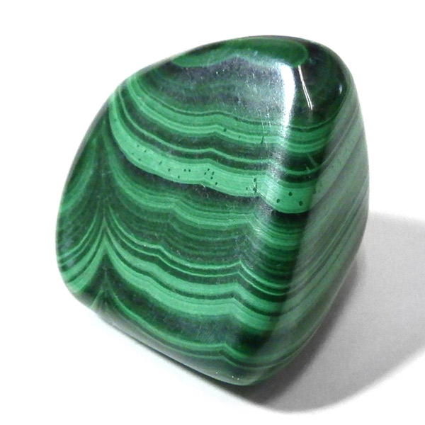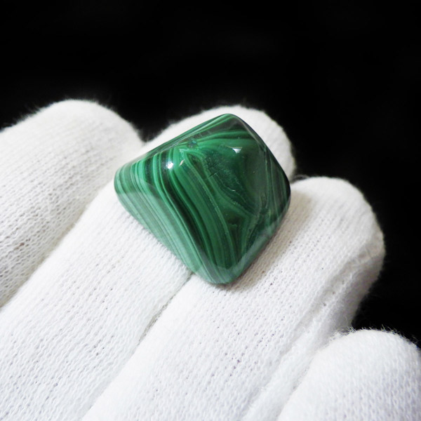 コンゴ産のマラカイト、タンブルです。濃いグリーンカラーに独特の模様を持つマラカイト。 「マラカイトグリーン」という色名になっているほど、特徴的で美しい緑色です。 マラカイトの産地はアメリカ・ロシア・コンゴ・ザンビアなどですが、中でもコンゴ産のマラカイトは非常に美しいものが採れるため、コレクターからも支持されています。