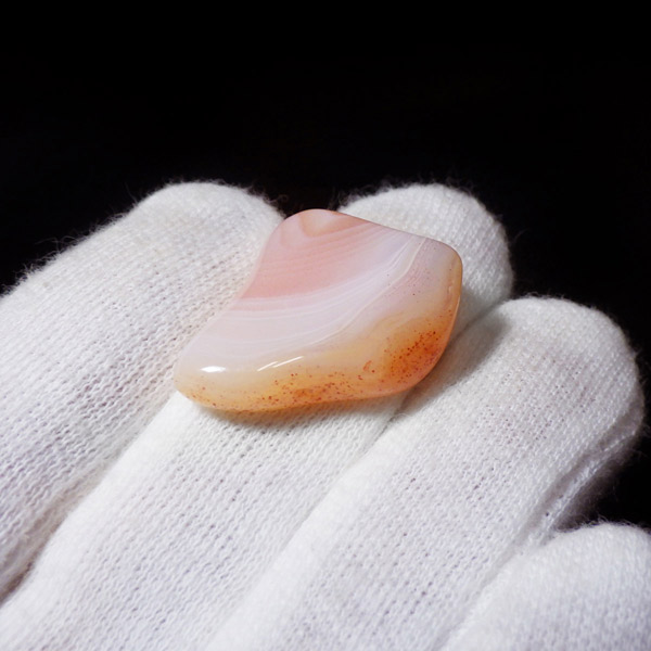 ボツワナ産のアプリコットアゲート、タンブルです。アプリコットアゲートは、優しいアプリコットカラーが特徴の瑪瑙(アゲート)の種類です。アプリコット、いわゆる杏カラーのアゲートです。天然石のカラーニックネームによく果物などが使われることが多くあります。温かみのあるオレンジやピンクのトーンと縞模様が、穏やかで安心感のあるエネルギーをもたらし、心を和ませてくれます。
