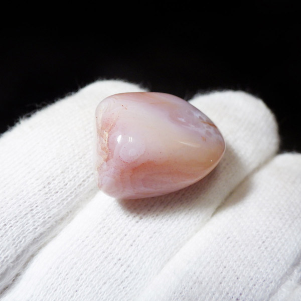 ボツワナ産のアプリコットアゲート、タンブルです。アプリコットアゲートは、優しいアプリコットカラーが特徴の瑪瑙(アゲート)の種類です。アプリコット、いわゆる杏カラーのアゲートです。天然石のカラーニックネームによく果物などが使われることが多くあります。温かみのあるオレンジやピンクのトーンと縞模様が、穏やかで安心感のあるエネルギーをもたらし、心を和ませてくれます。