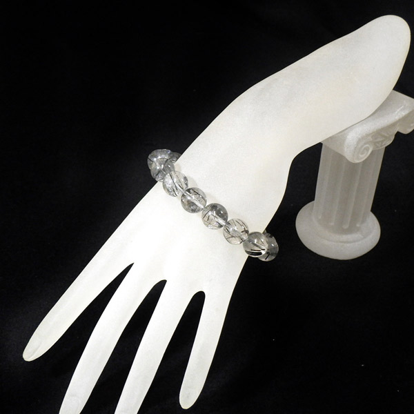 ブラジル産ブラックルチルクォーツのブレスレットです。透明度が高く、程よく針が入った玉を集めて作成した一点です。流通名はブラックルチルクォーツですが内包物の正確な鉱物名はブラックトルマリンになります。