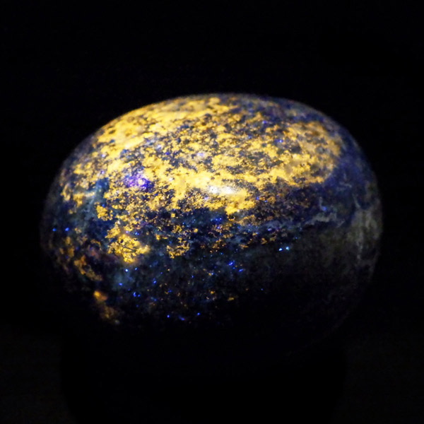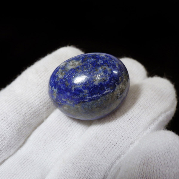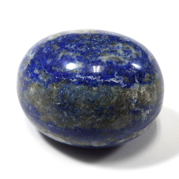 アフガニスタン産のラピスラズリ、タンブルです。 ラピスラズリは、ラズライト・アウィン・ソーダライト・ノーゼライトが集合したものです。特に、ラズライトとノーゼライトを多く含有すると、深く美しい色彩のラピスラズリとなります。全体的に、均一な色彩のものは少なく、黄金色の「パイライト」、白色の「カルサイト」など"が小さな斑点としてみられます。一部365nmのブラックライトで蛍光を示します。