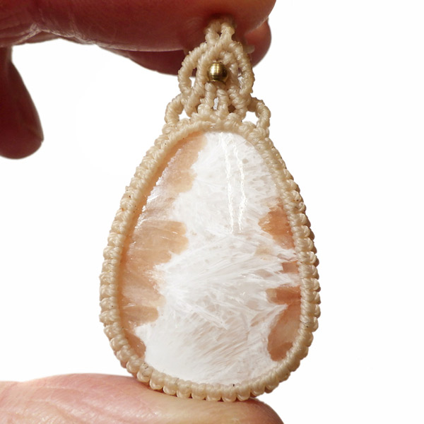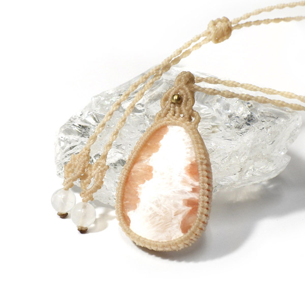 繊細で美しい輝きを放つ、インド産のスコレサイト with スティルバイトを使用したマクラメペンダントです。スコレサイトをメインに、スティルバイトの模様が絶妙なバランスで共生しており、自然が生み出した芸術的な美しさを楽しめます。
