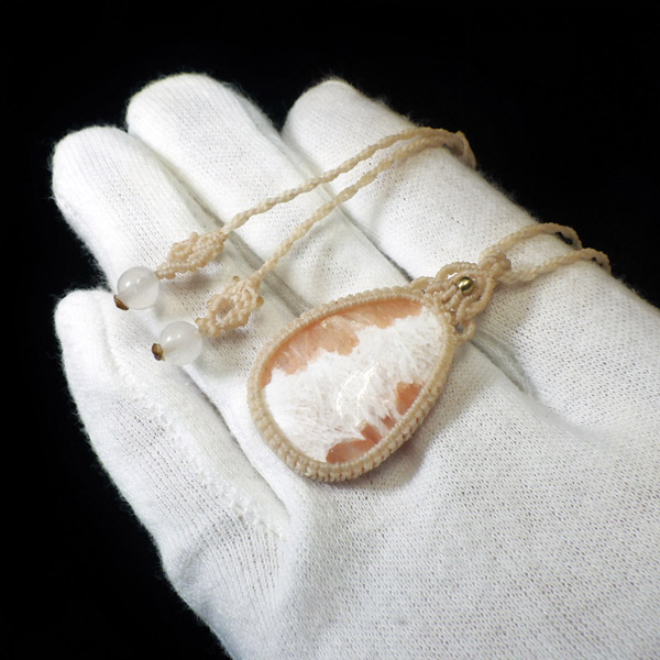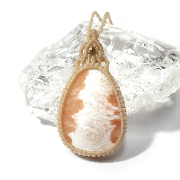 オレンジの束状がスティルバイト、白く細長い繊維状の結晶がスコレサイトです。スコレサイトは純粋さや調和を象徴し、心を穏やかに整えてくれる石。深い癒しをもたらすといわれています。スティルバイトは優しさと安らぎの波動を持ち、感情のバランスを整えるサポートをしてくれる石。直感力や創造力を高めるともいわれています。この2つの鉱物が織りなす神秘的なハーモニーにより、穏やかでスピリチュアルなエネルギーを放つ特別なペンダントとなっています。