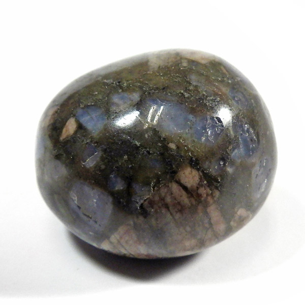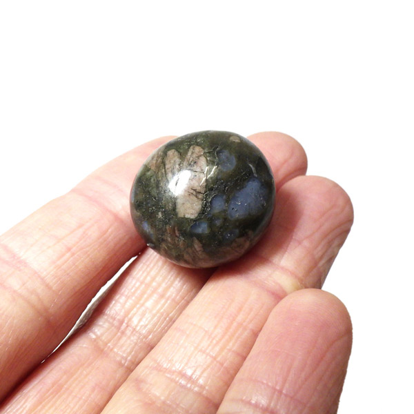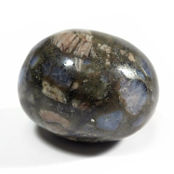 ブラジル産のケセラストーン、タンブルです。ケセラストーン(コングロメレイト)は、スーパーセブンの名付け親でもあるアメリカのクリスタルヒーラー「メロディ女史」が、2008年のツーソンショーにおいて発表した新しいパワーストーンです。ブラジル・バイア州ジュアゼイロ周辺で産出されます。一つの石の中にクォーツ・ブルーオパール・カルサイト・カオリナイト・クリノゾイサイト・マグネタイト・斜長石など、多くの鉱物が混ざり合った状態で産出されます。そのため、様々な色合いが見られ、レンガ色・青色・肌色・茶色などが見え、 その独特の模様は見ていて飽きません。