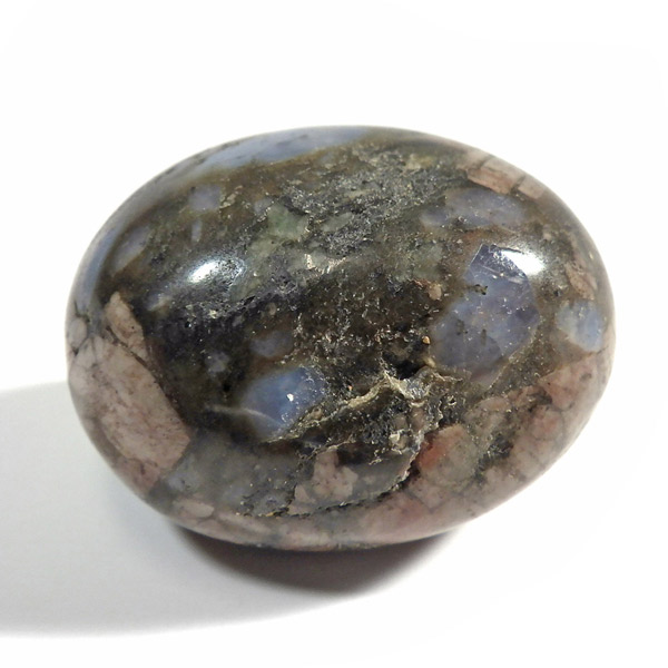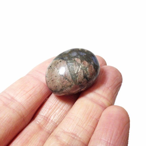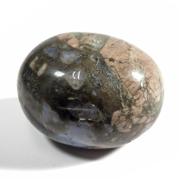 ブラジル産のケセラストーン、タンブルです。ケセラストーン(コングロメレイト)は、スーパーセブンの名付け親でもあるアメリカのクリスタルヒーラー「メロディ女史」が、2008年のツーソンショーにおいて発表した新しいパワーストーンです。ブラジル・バイア州ジュアゼイロ周辺で産出されます。一つの石の中にクォーツ・ブルーオパール・カルサイト・カオリナイト・クリノゾイサイト・マグネタイト・斜長石など、多くの鉱物が混ざり合った状態で産出されます。そのため、様々な色合いが見られ、レンガ色・青色・肌色・茶色などが見え、 その独特の模様は見ていて飽きません。