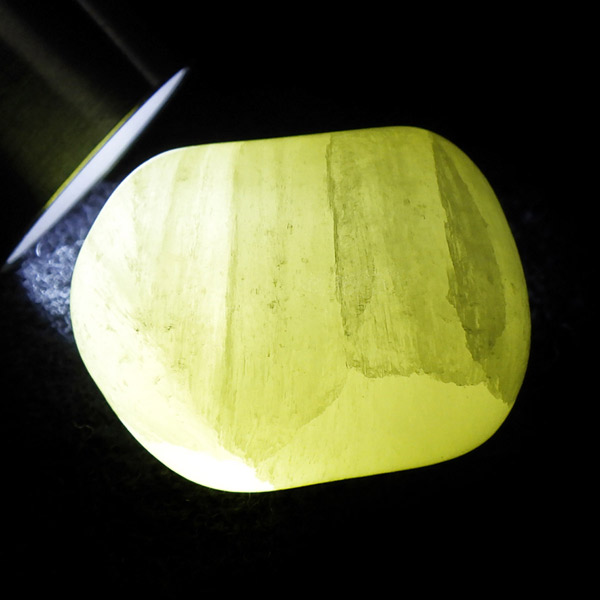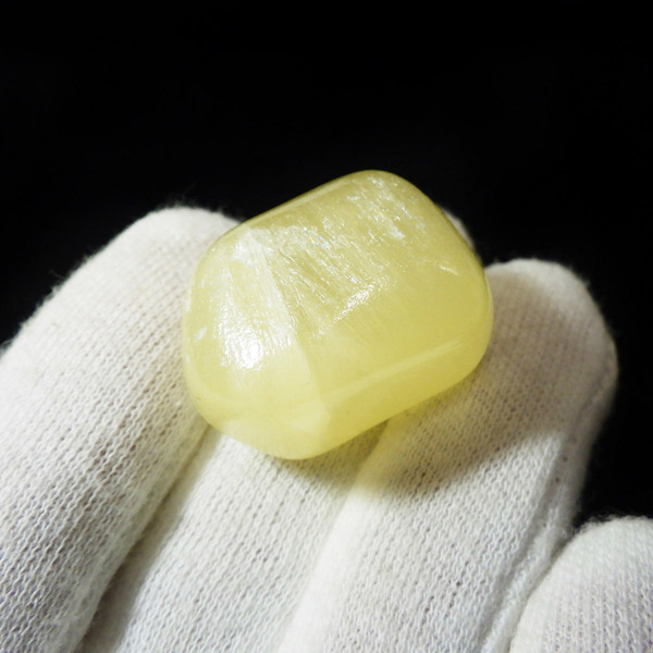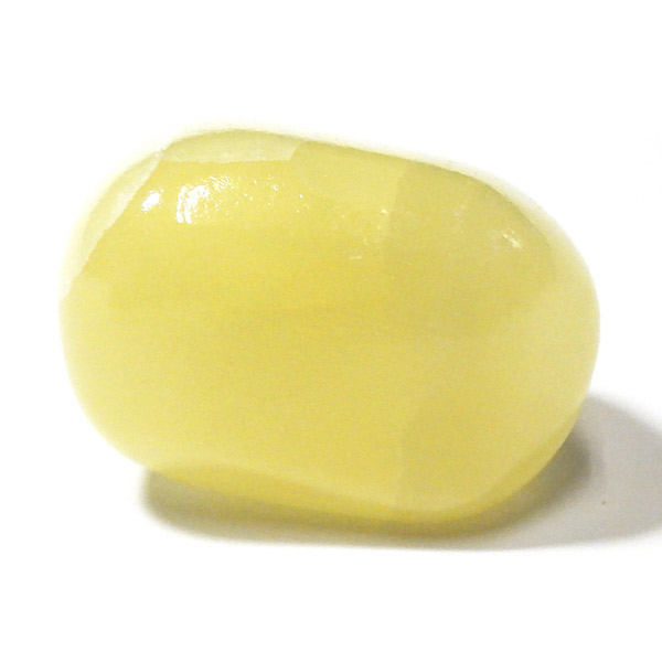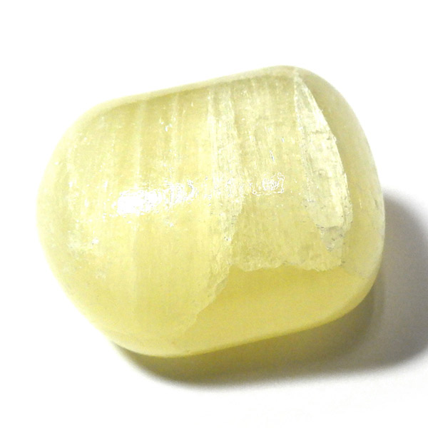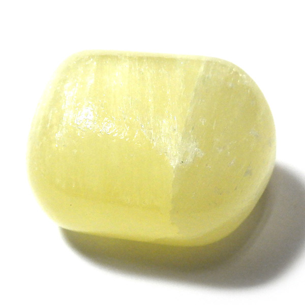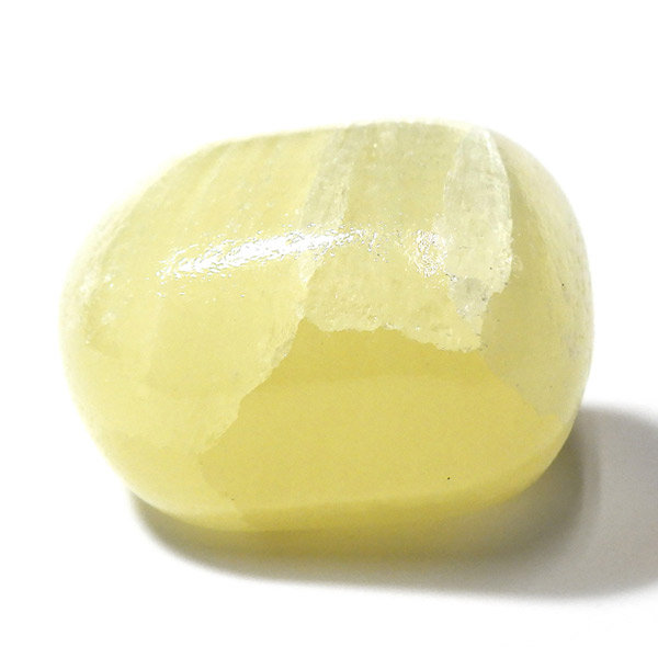 アフガニスタン産、イエローカルサイトのタンブルです。カルサイトはイエロー以外にもグリーン、ピンク、オレンジ、ブルーなどと含まれる成分により様々なカラーバリエーションがあります。純粋なカルサイトは無色ですが、鉄分が含まれることで黄色になります。その見た目からパイナップルカルサイトとも呼ばれています。オレンジでもグリーンでもない、パイナップルカラーのイエローと白い筋がまさパイナップルの果肉にそっくりですね。フラッシュライトなどで光を通してもきれいです。