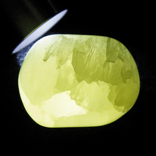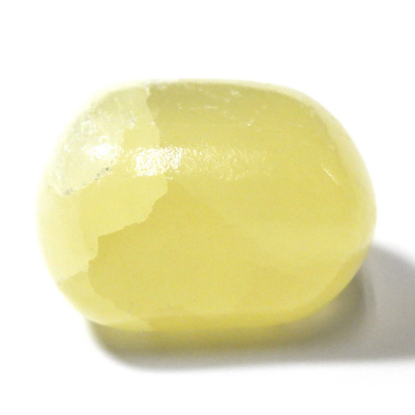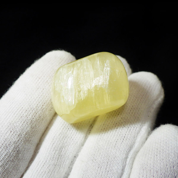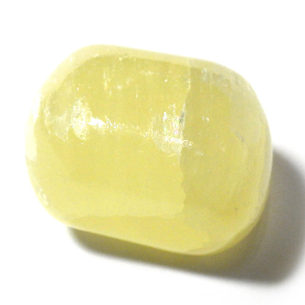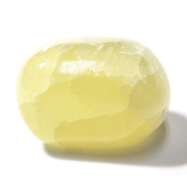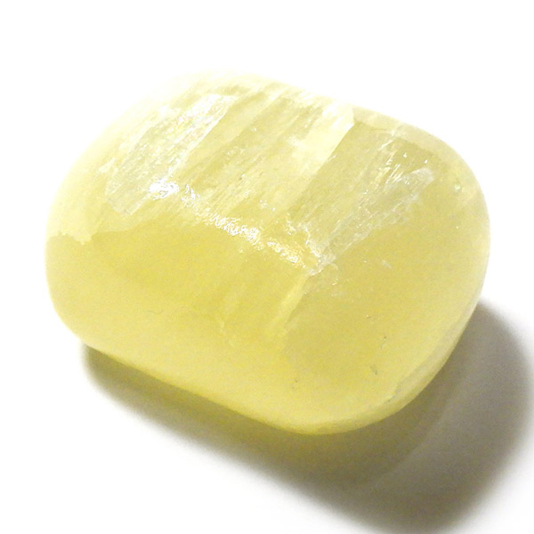アフガニスタン産、イエローカルサイトのタンブルです。カルサイトはイエロー以外にもグリーン、ピンク、オレンジ、ブルーなどと含まれる成分により様々なカラーバリエーションがあります。純粋なカルサイトは無色ですが、鉄分が含まれることで黄色になります。その見た目からパイナップルカルサイトとも呼ばれています。オレンジでもグリーンでもない、パイナップルカラーのイエローと白い筋がまさパイナップルの果肉にそっくりですね。フラッシュライトなどで光を通してもきれいです。