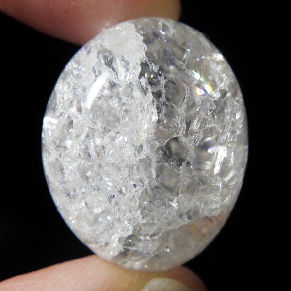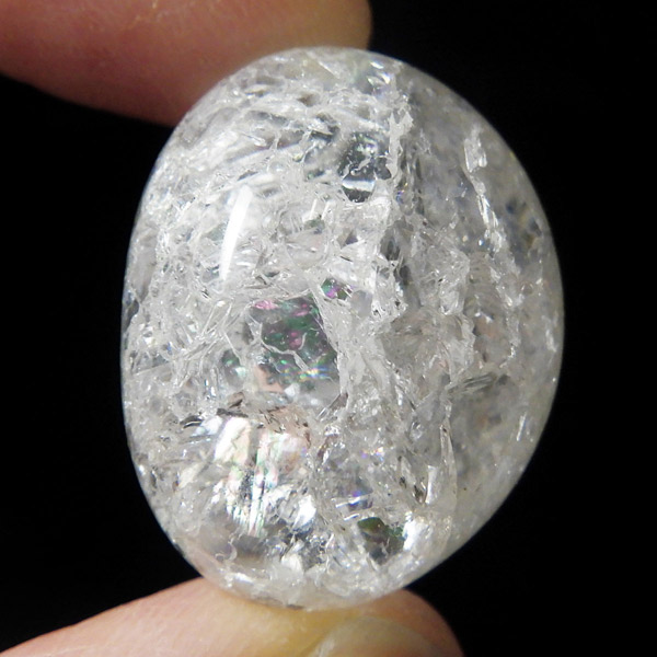 ブラジル産のクラッククォーツ、タンブルです。天然の水晶に人工的にクラック処理を施して作っています。 通常のクリアなクォーツとは異なり、ひび割れ部分が光を乱反射することで、キラッキラッした煌めきと虹色の輝きを見せてくれます。濁りの少ない透明度の良い水晶をしているので、美しさが際立ちます。お部屋に飾ったり、お守りとして持ち運んだり、良い気を運んでくれそうです。