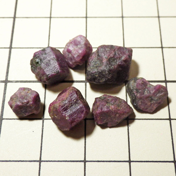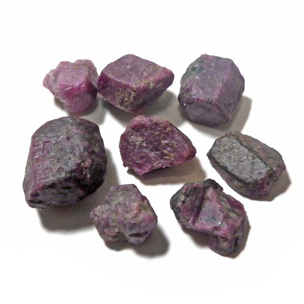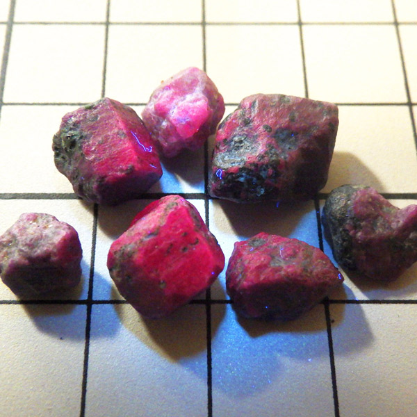 限られた鉱脈から採掘される、貴重なルビーの小さな原石を複数個詰め合わせています。ルビーは宝石名で赤色のコランダム(鋼玉)のことをルビーと呼びます。その他の色のコランダムは全てサファイアになります。ルビーの結晶が小さいのは、赤い色の原因である微量のクロムが結晶成長を妨げるためで、赤色のルビーのみ飛びぬけて貴重になります。ブラックライトを照射することでルビーレッドが鮮やかに蛍光します。