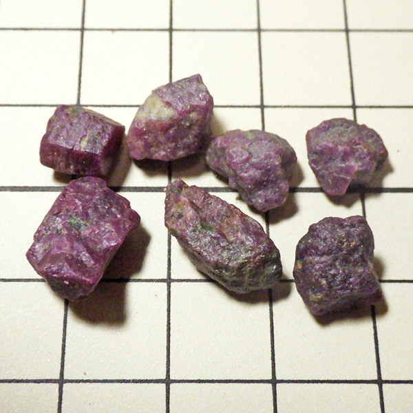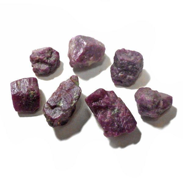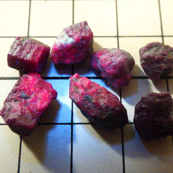 限られた鉱脈から採掘される、貴重なルビーの小さな原石を複数個詰め合わせています。ルビーは宝石名で赤色のコランダム(鋼玉)のことをルビーと呼びます。その他の色のコランダムは全てサファイアになります。ルビーの結晶が小さいのは、赤い色の原因である微量のクロムが結晶成長を妨げるためで、赤色のルビーのみ飛びぬけて貴重になります。ブラックライトを照射することでルビーレッドが鮮やかに蛍光します。