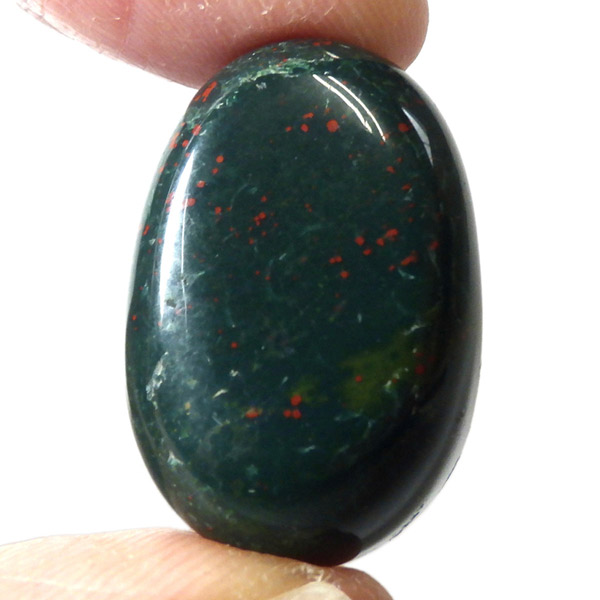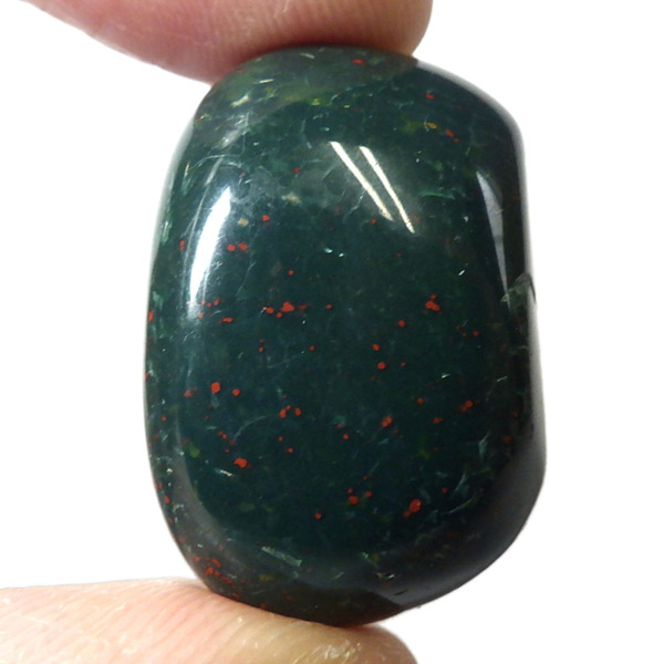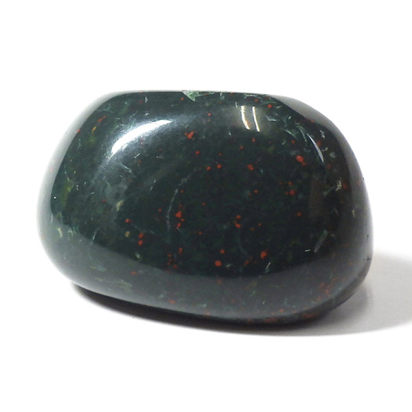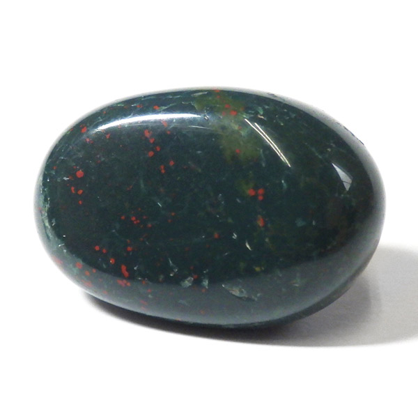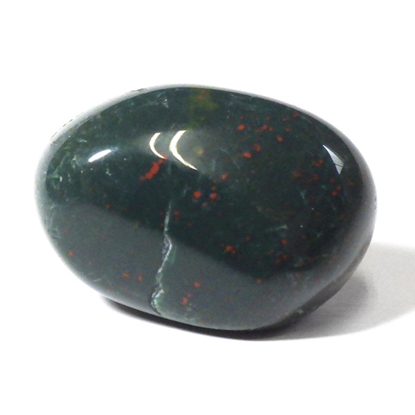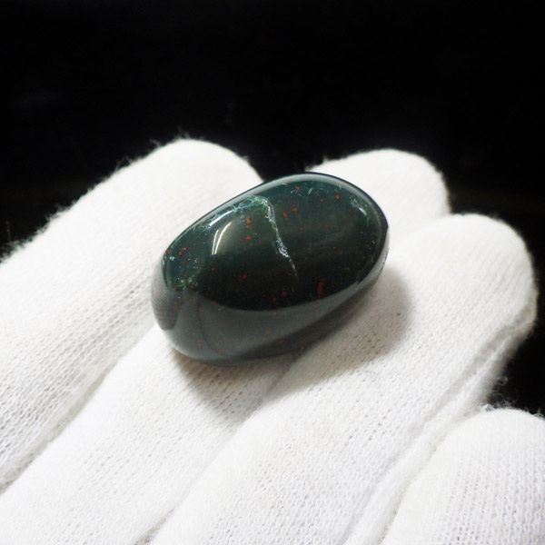 インド産のブラッドストーン、タンブルです。ブラッドストーンはジャスパーの一種で濃緑色の地に赤い斑点や模様の入った石です。鉄に起因する赤い斑点が見られる石で、赤斑点が血の様に見られることからブラッドストーンと呼ばれています。