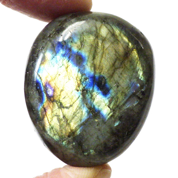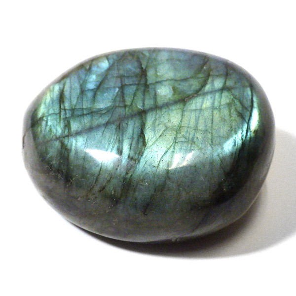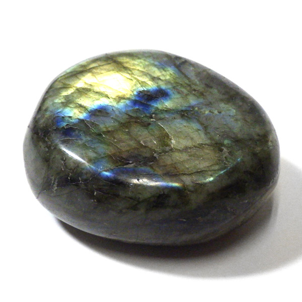 マダガスカル産のラブラドライト磨きペブルです。 見る角度によってオーロラのような色彩を変える美しい光を持つのが特徴です。 石自体はグレーなどの地味めな色合いをしていますが、そこに鮮やかな輝きが浮かび上がるところから「アゲハ蝶の羽」に例えられる事もある美しい石です。 ラブラドライトは、月・太陽を象徴するといわれています。根気強い実行力を養い、信念を貫けるよう導く力があるとされます。そして、直感力・洞察力・創造性を高めてくれるでしょう。自信を失いかけた時に、生まれた意味・生きる意味を気づかせるサポートをしてくれ、生きる力を引き出してくれるといわれています。