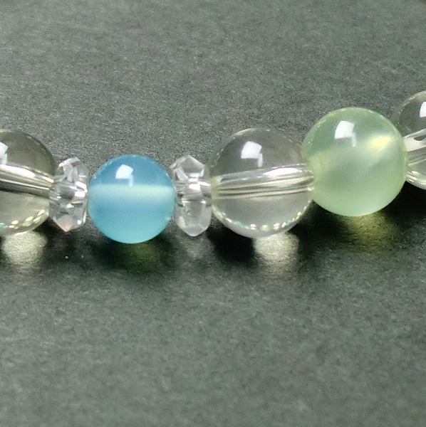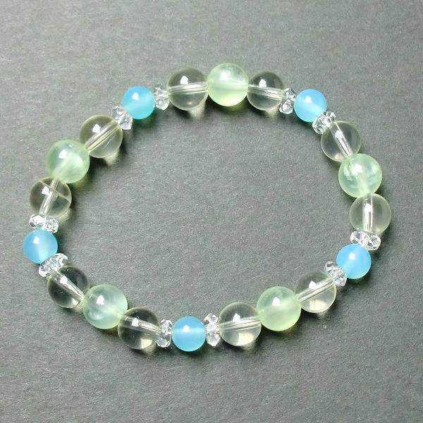 プレナイトを中心にシーブルーカルセドニーなど鮮やかな色の石を集めたオリジナル天然石ブレスです。
