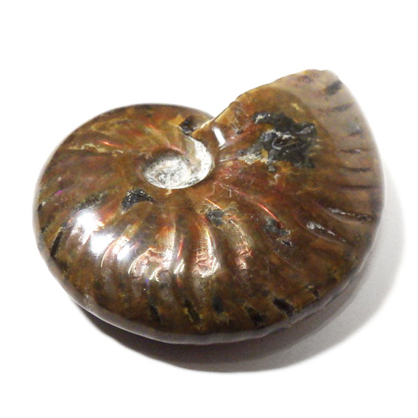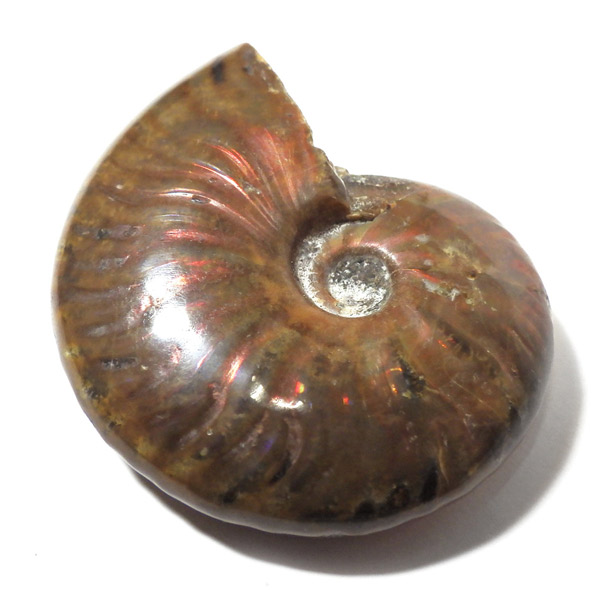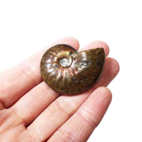 マダガスカル産、アンモナイトの化石です。虹色の遊色もしっかりと出ています。実際に手に取って自然の神秘を感じてほしい一点です。 アンモナイトはアンモン貝(オウムガイの先祖)の化石です。およそ7000年前に生息していたアンモン貝。「アンモナイト」という名前は、18世紀頃のエジプトで、神アンモンに捧げる羊の角の代わりとして使用されたことから名付けられました。 アンモン貝は、劣化しにくい殻という特徴のため、化石として美しい状態で出土されることが多く有名です。