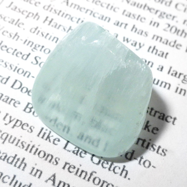 アフガニスタン産のピスタチオカルサイト(グリーンカルサイト)タンブルです。アフガニスタンでは、淡いピンクやブルー、グリーンなどの多彩なカルサイトが産出します。淡いグリーンのカルサイトは、その色調や濃淡などによって、様々なニックネームがあるようです。同じグリーンカルサイトでも、色が薄く縞目模様が確認出来るものなどは、海に浮かぶ泡に倣って シーフォームカルサイトなどと呼ばれる事もあるようです。このピスタチオカルサイトも、ニックネームで鉱物名ではありませんが、殻を剥いたあとのピスタチオのように、鮮やかでかわいらしいカルサイトです。
