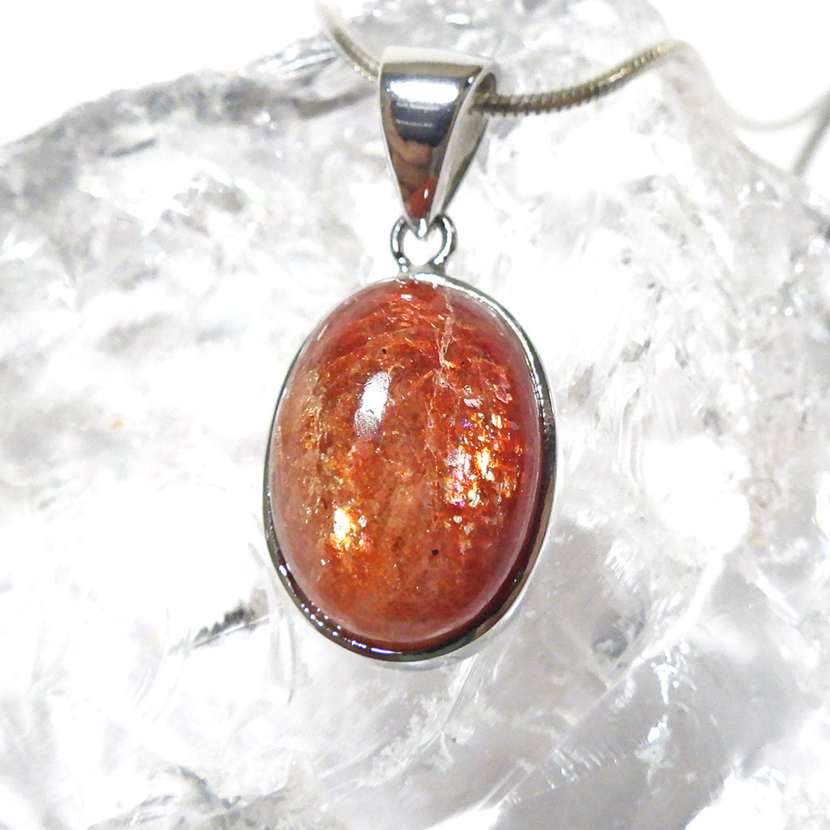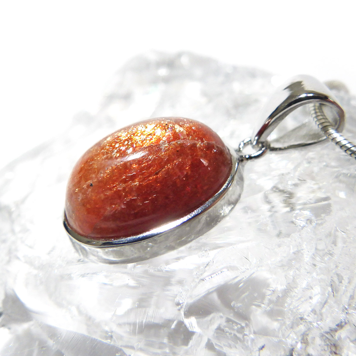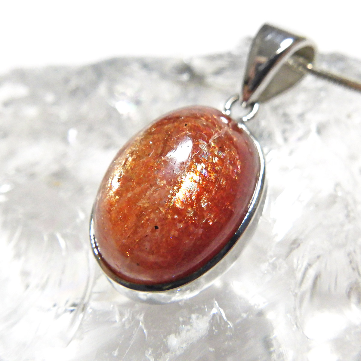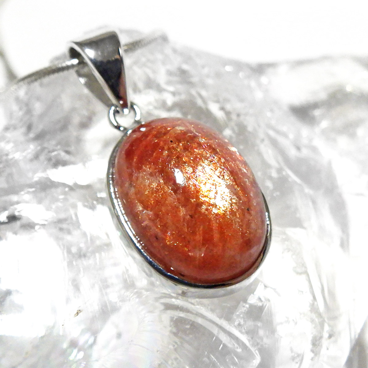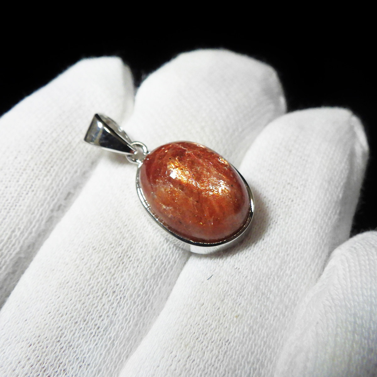 表面には太陽のような輝きが広がり、目を凝らすとキメ細やかなマイカ(雲母)の煌めきが現れます。 通常は白濁しやすいサンストーンの中で、これほどまでに高い透明感を持つものは極めて稀。まさに特別な逸品です。