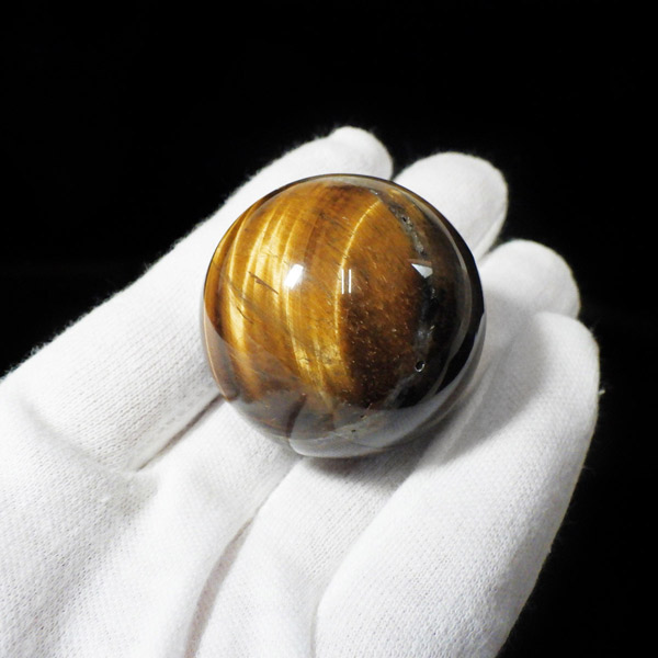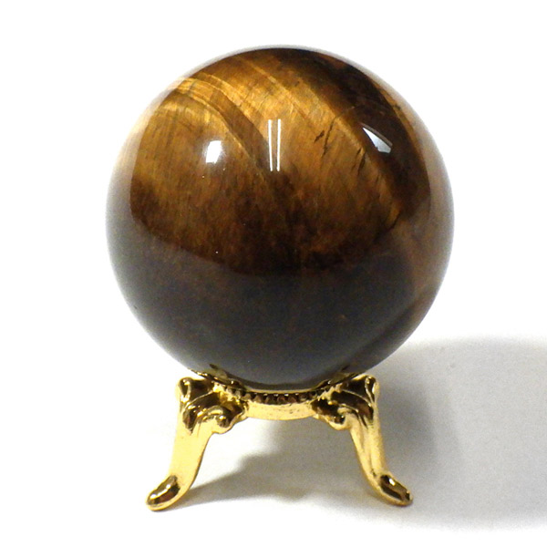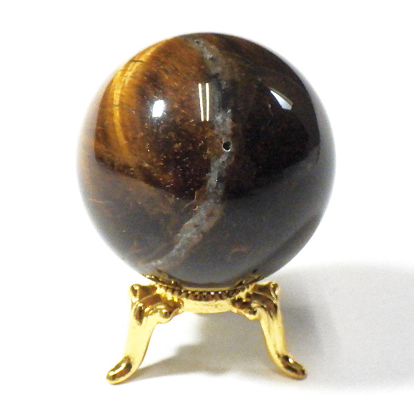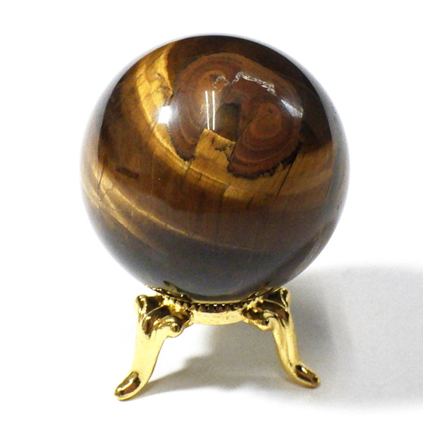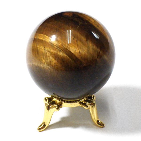 南アフリカ産のタイガーアイ球です。タイガーアイは、キャッツアイ効果で茶色から金色の縞模様が浮かび、輝きが虎の目を連想させる事からタイガーアイと呼ばれるようになりました。 一般的に金運といえばタイガーアイで、水晶やアメジストなどと同等の認知度があり、非常に人気がある石です。